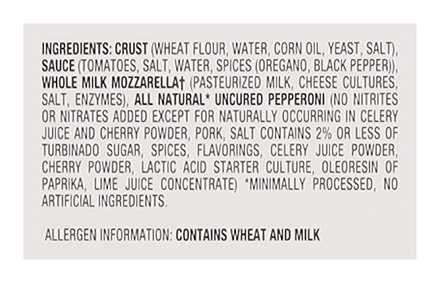 Ingredients: Crust (Wheat Flour, Water, Corn Oil, Yeast, Salt), Sauce (Tomatoes, Salt, Water, Spices (Oregano, Black Pepper)), Whole Milk Mozzarella(a) (Pasteurized Milk, Cheese Cultures, Salt, Enzymes), All Natural* Uncured Pepperoni (No Nitrites or Nitrates Added Except for Naturally Occurring in Celery Juice and Cherry Powder, Pork, Salt Contains 2% or Less of Turbinado Sugar, Spices, Flavorings, Celery Juice Powder, Cherry Powder, Lactic Acid Starter Culture, Oleoresin of Paprika, Lime Juice Concentrate). * Minimally Processed, No Artificial Ingredients. (a) Cheese from Milk of Cows Not Treated with Rbst, No Significant Difference Has Been Shown Between Milk Derived from Rbst Treated and Non-Rbst Treated Cows Contains: Wheat, Milk, Celery