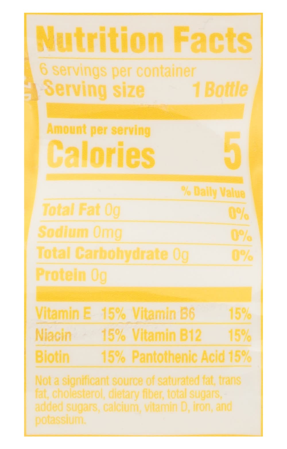 Ingredients: Carbonated Water, Contains 2% or Less of: Clarified Lemon Juice Concentrate, Beta Carotene (for Color), Natural Flavors, Green Tea Extract, D-Alpha-Tocopherol Acetate (Vitamin E), Niacinamide (Vitamin B3), Calcium Pantothenate (Vitamin B5), Pyridoxine Hydrochloride (Vitamin B6), Biotin, Cyanocobalamin (Vitamin B12), Sucralose, Citric Acid, Gum Arabic, Ester Gum, Calcium Disodium EDTA (to Protect Flavor), Potassium Benzoate (to Ensure Freshness)