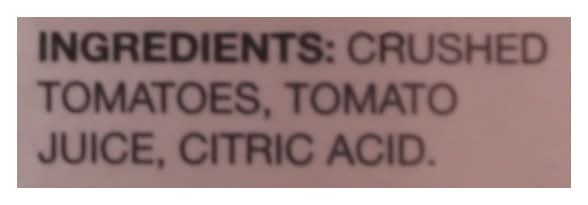 Ingredients: Crushed Tomatoes Tomato Juice Citric Acid.