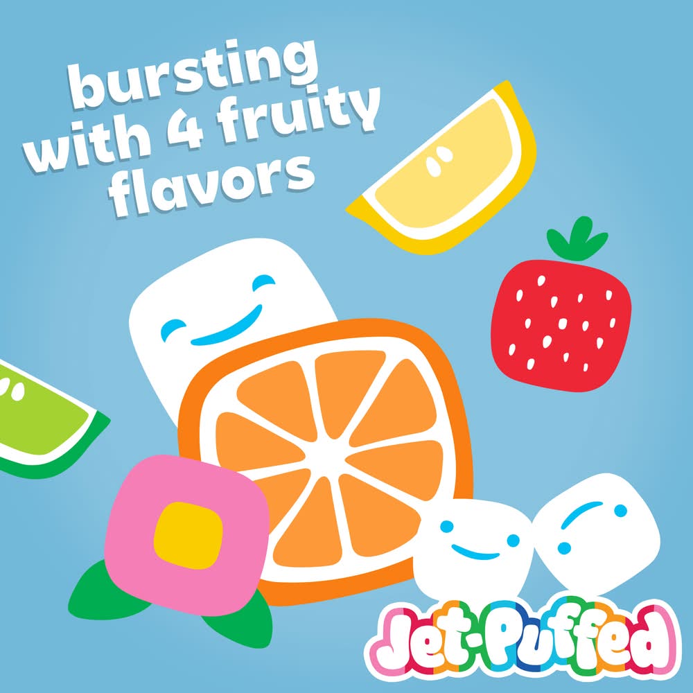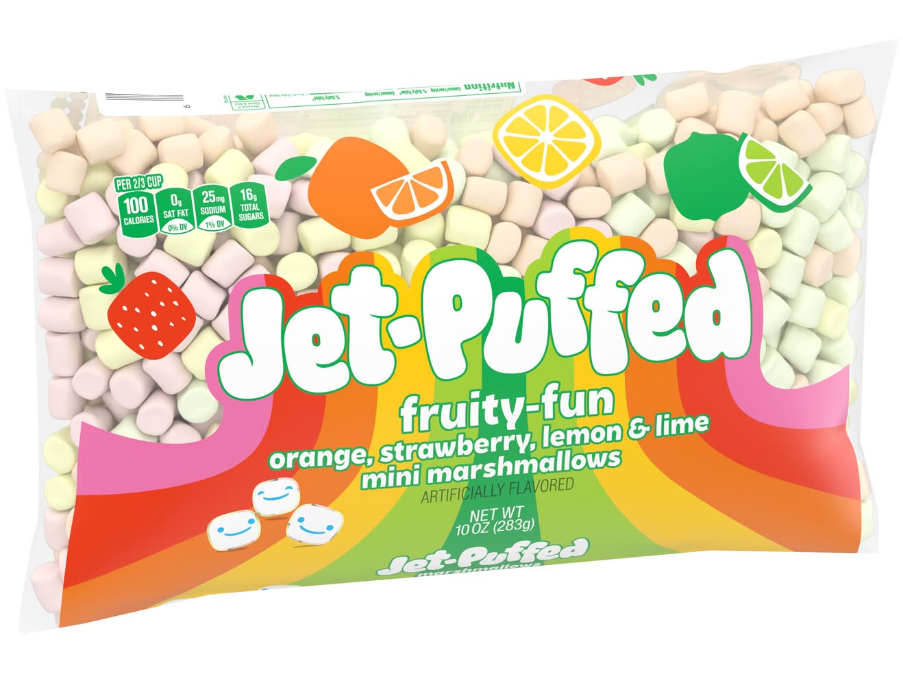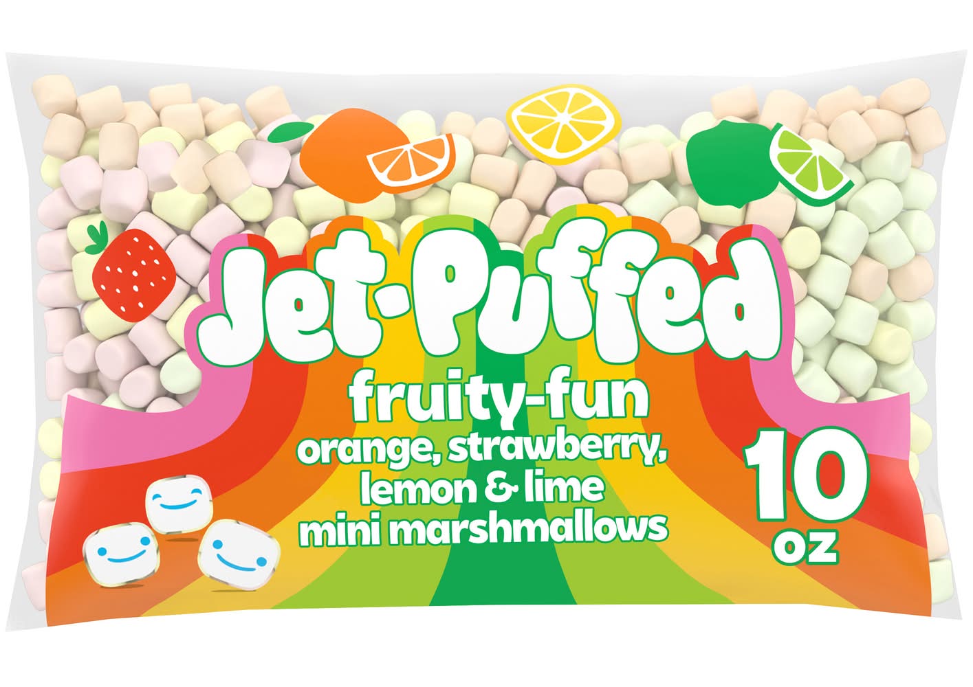 Jet-Puffed Fruity Fun Miniature Marshmallows are a delicious and versatile dessert topping. Our colored miniature marshmallows deliver the sweet taste and fluffy texture you know from Jet-Puffed with orange, strawberry, lemon and lime flavors. With zero grams of trans fat and total fat per serving, our colored miniature marshmallows make a great fat-free snack. They’re also a fun addition to your favorite marshmallow dessert recipes. Try using our mini colored marshmallows to make a tropical ambrosia salad or a fruity rice cereal marshmallow treat. You can even enjoy them on their own whenever a craving hits. Our bite sized marshmallows come packaged in a sealed 10-ounce bag.