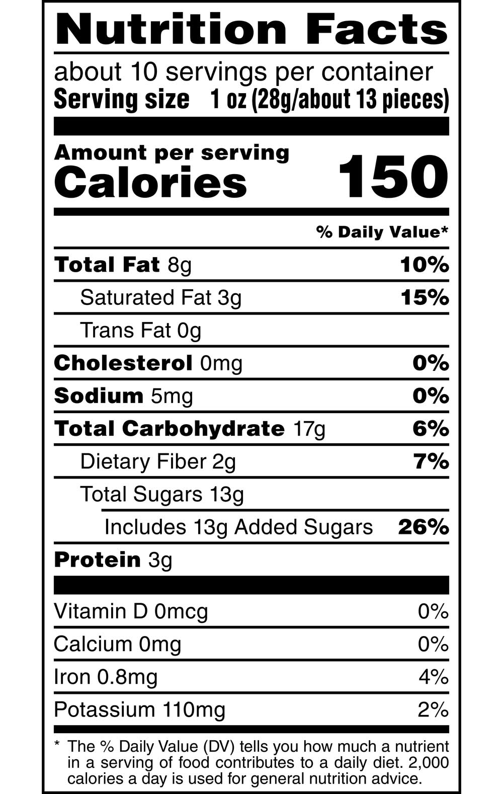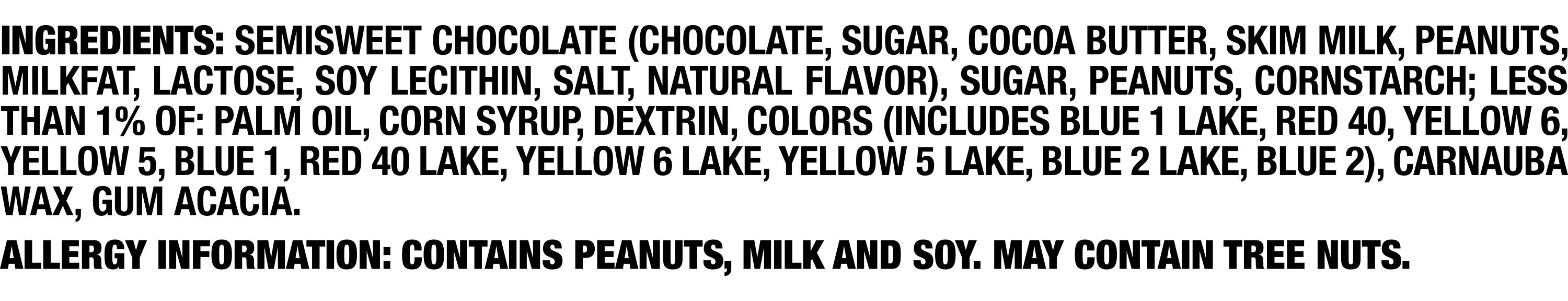 Ingredients: INGREDIENTS: SEMISWEET CHOCOLATE (CHOCOLATE, SUGAR, COCOA BUTTER, SKIM MILK, PEANUTS, MILKFAT, LACTOSE, SOY LECITHIN, SALT, NATURAL FLAVOR), SUGAR, PEANUTS, CORNSTARCH; LESS THAN 1% OF: PALM OIL, CORN SYRUP, DEXTRIN, COLORS (INCLUDES BLUE 1 LAKE, RED 40, YELLOW 6, YELLOW 5, BLUE 1, RED 40 LAKE, YELLOW 6 LAKE, YELLOW 5 LAKE, BLUE 2 LAKE, BLUE 2), CARNAUBA WAX, GUM ACACIA. Contains: ALLERGY INFORMATION: CONTAINS PEANUTS, MILK AND SOY. MAY CONTAIN TREE NUTS.