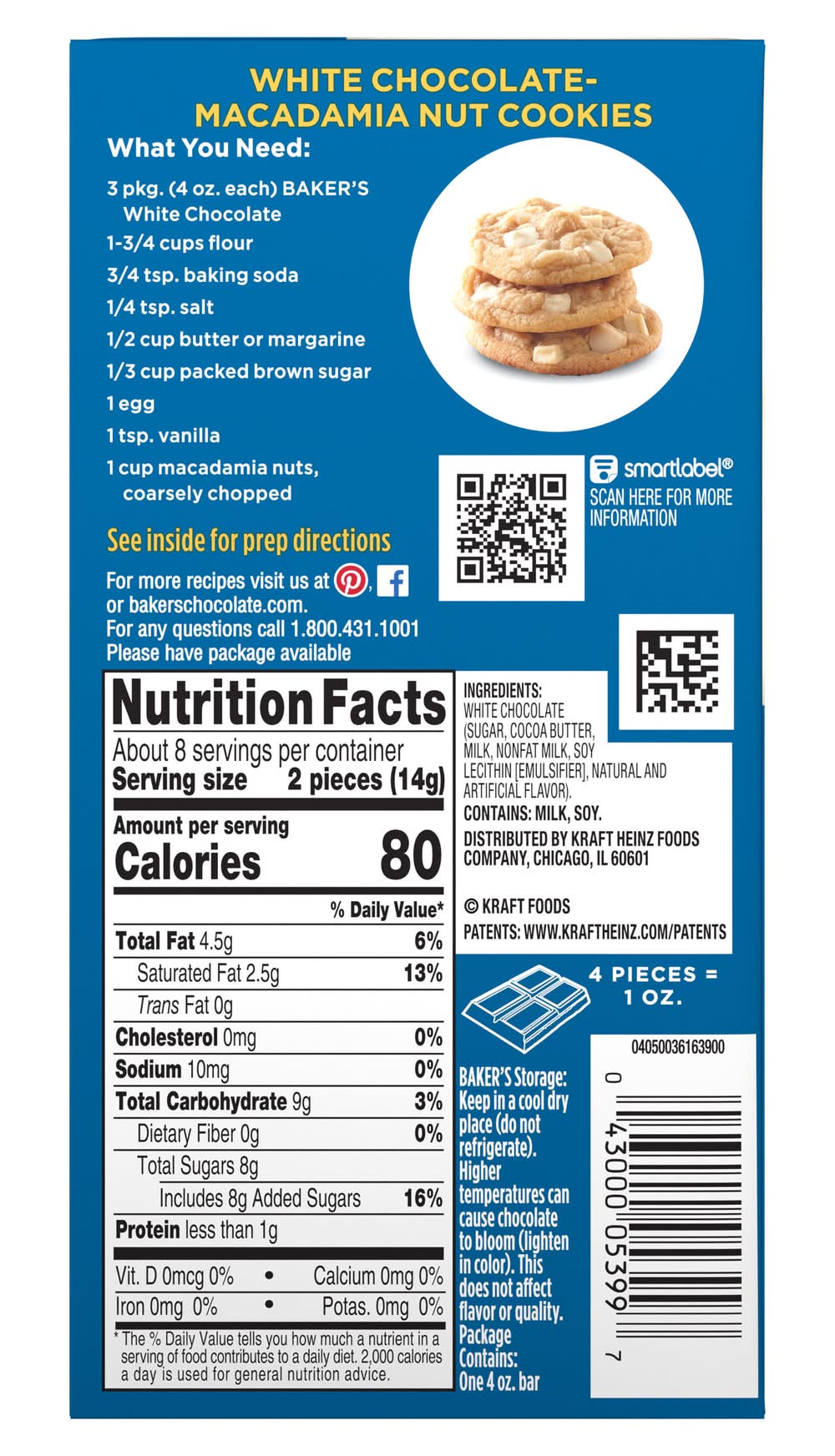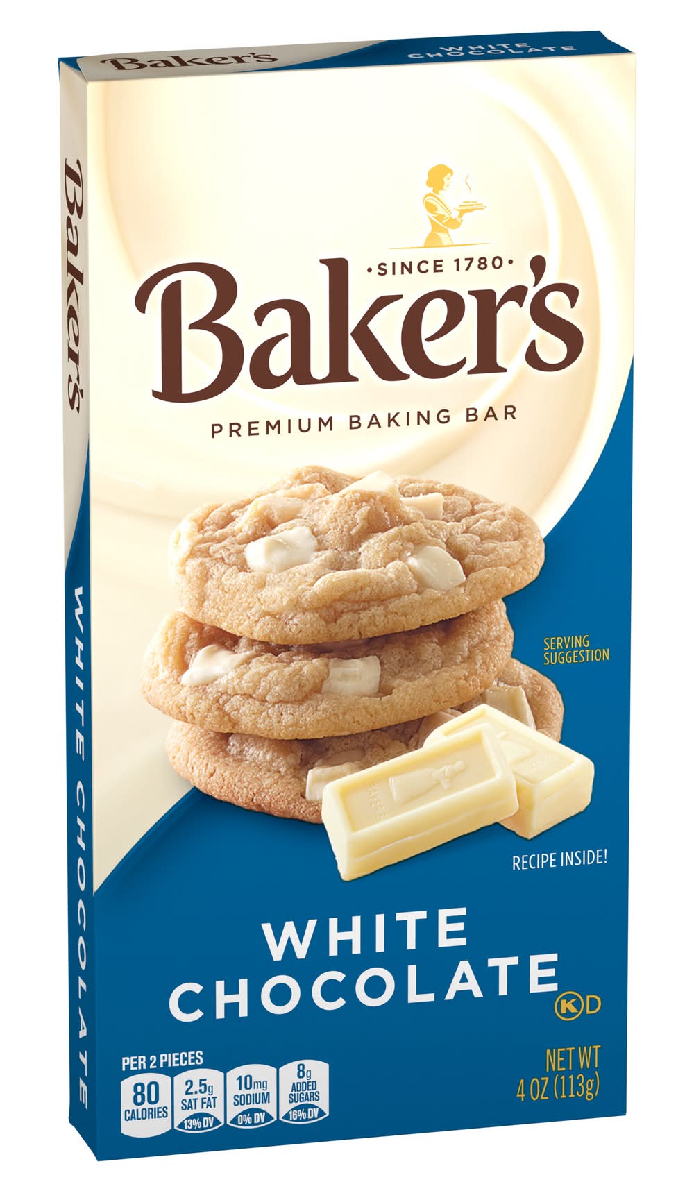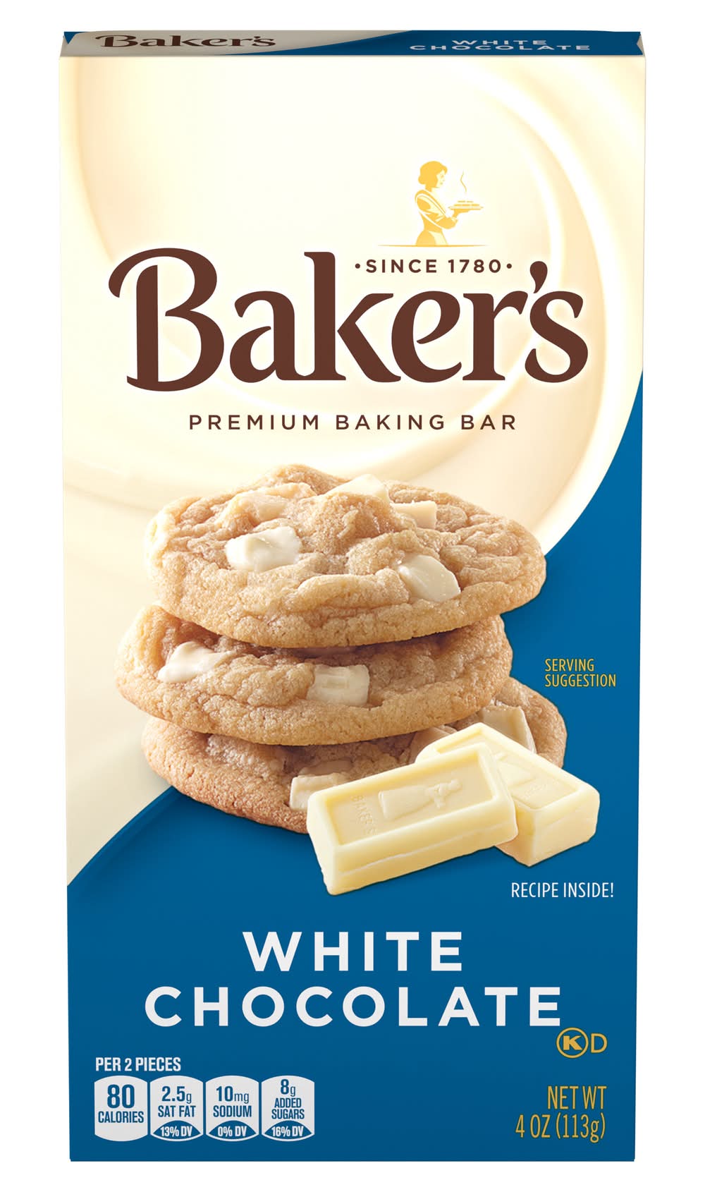Baker's Premium White Chocolate Baking Bar adds a special touch to your favorite white chocolate recipes. America's favorite baking chocolate since 1780 introduces this perfectly sweetened ingredient to enhance your homemade cakes, cookies and candies. A creamy mixture of cocoa butter, sugar and milk creates a premium white chocolate for baking and any other dessert recipes. Made with no cocoa powder, this baking chocolate delivers a unique experience for chocolate lovers with its creamy white color and smooth taste. The new scored bar snaps cleanly into 1/4 oz. pieces, so you can make small batches with the same precision as large recipes. Simply break off four pieces to measure 1 oz. of white chocolate for baking. Use this chocolate as an ingredient for white chocolate chunk cookies, cheesecakes and dessert bars, or heat the meltable white chocolate in the microwave to drizzle over your favorite confections. A paper wrapper keeps unused portions contained inside the box until your next baking session. To maximize freshness, store this 4 ounce boxed chocolate bar at room temperature in a dry place. Kraft Heinz Foods Company, ChicagoIL60601