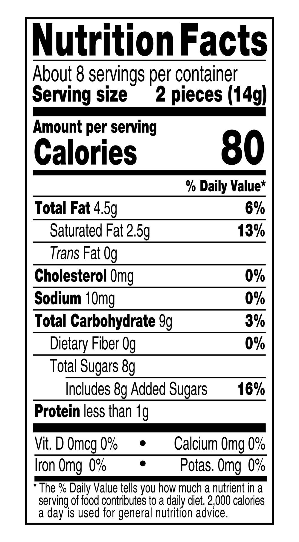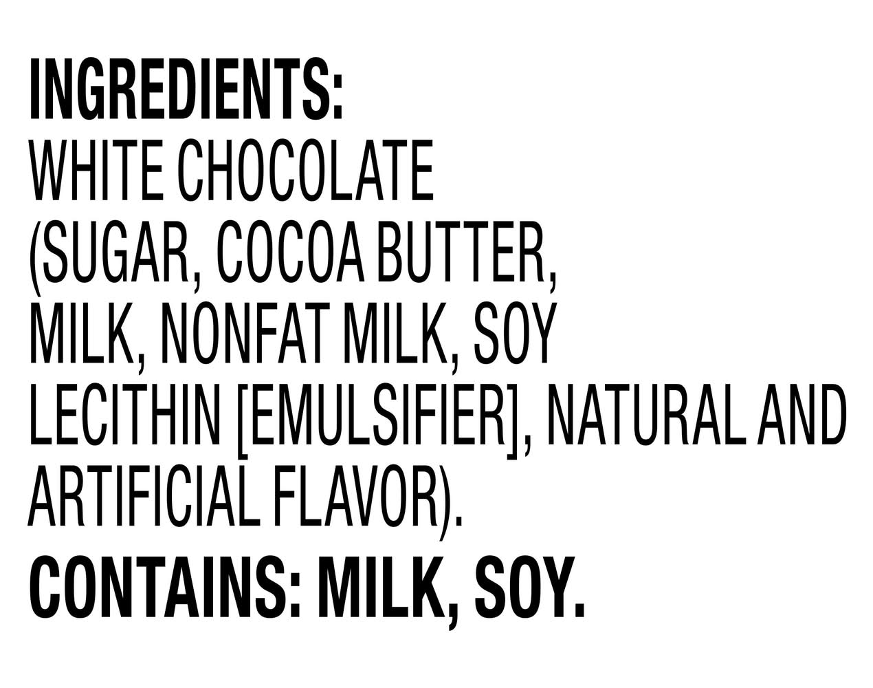 Ingredients: WHITE CHOCOLATE (SUGAR, COCOA BUTTER, MILK, NONFAT MILK, SOY LECITHIN [EMULSIFIER], NATURAL AND ARTIFICIAL FLAVOR), . Contains: CONTAINS: MILK, SOY.