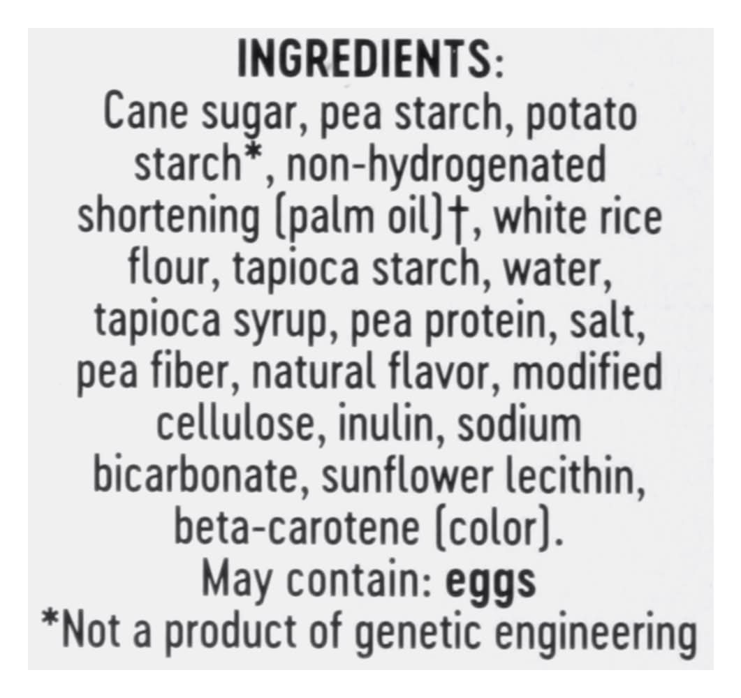 Ingredients: Cane Sugar, Pea Starch, Potato Starch (Not a Product of Genetic Engineering), Non-Hydrogenated Shortening (Palm Oil) (RSPO Certified), White Rice Flour, Tapioca Starch, Water, Tapioca Syrup, Pea Protein, Salt, Pea Fiber, Natural Flavor, Modified Cellulose, Inulin, Sodium Bicarbonate, Sunflower Lecithin, Beta-Carotene (Color) Contains: Eggs
