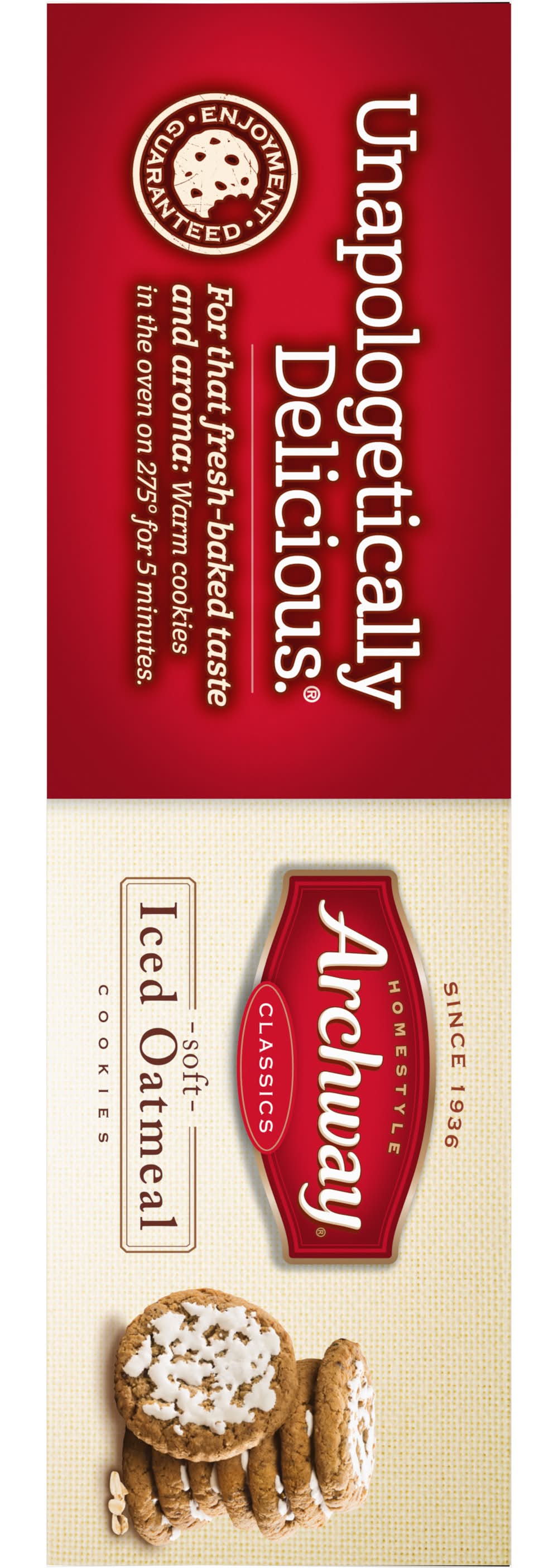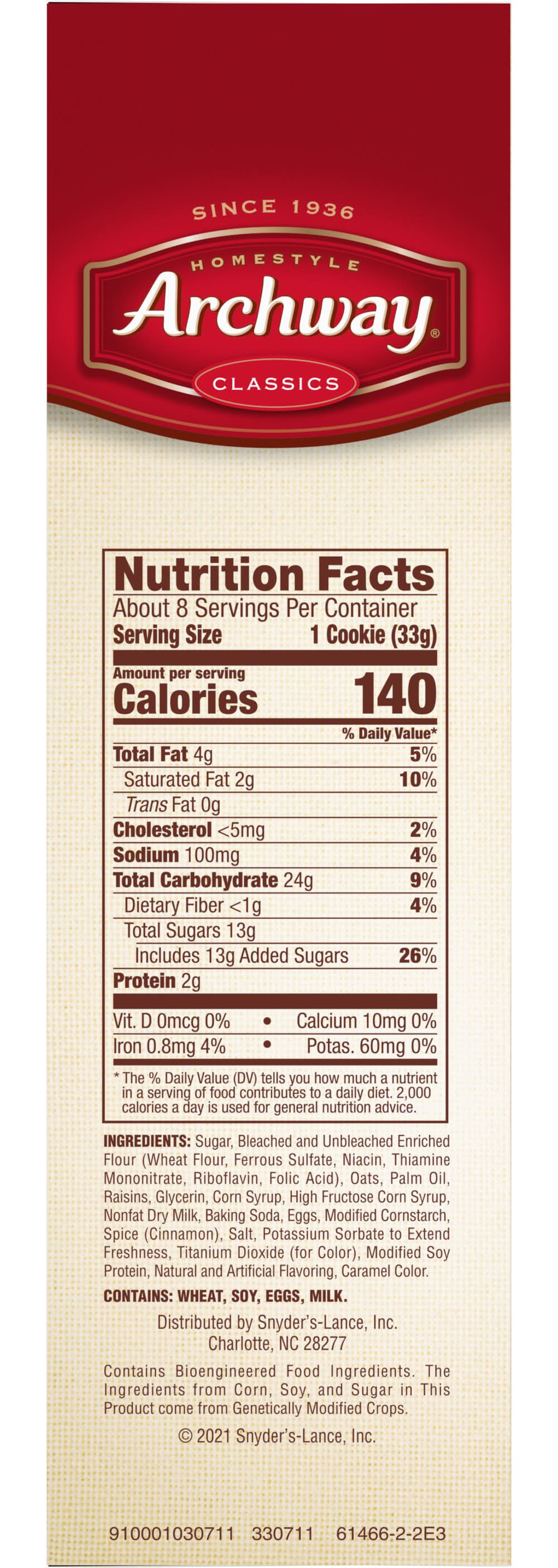 A mildly sweet oatmeal cookie topped with sweet icing ,our Oatmeal cookies have an exquisite home style flavor. Since 1936, Cookies have been winning the hearts of cookies lovers. Known for our home-style goodness, we strive to deliver high quality, highly enjoyable cookies with the ability to bring on nostalgic memories every single day. • Flavor: Soft iced oatmeal • Snyder's-Lance Inc., Charlotte,NC,28277-2706