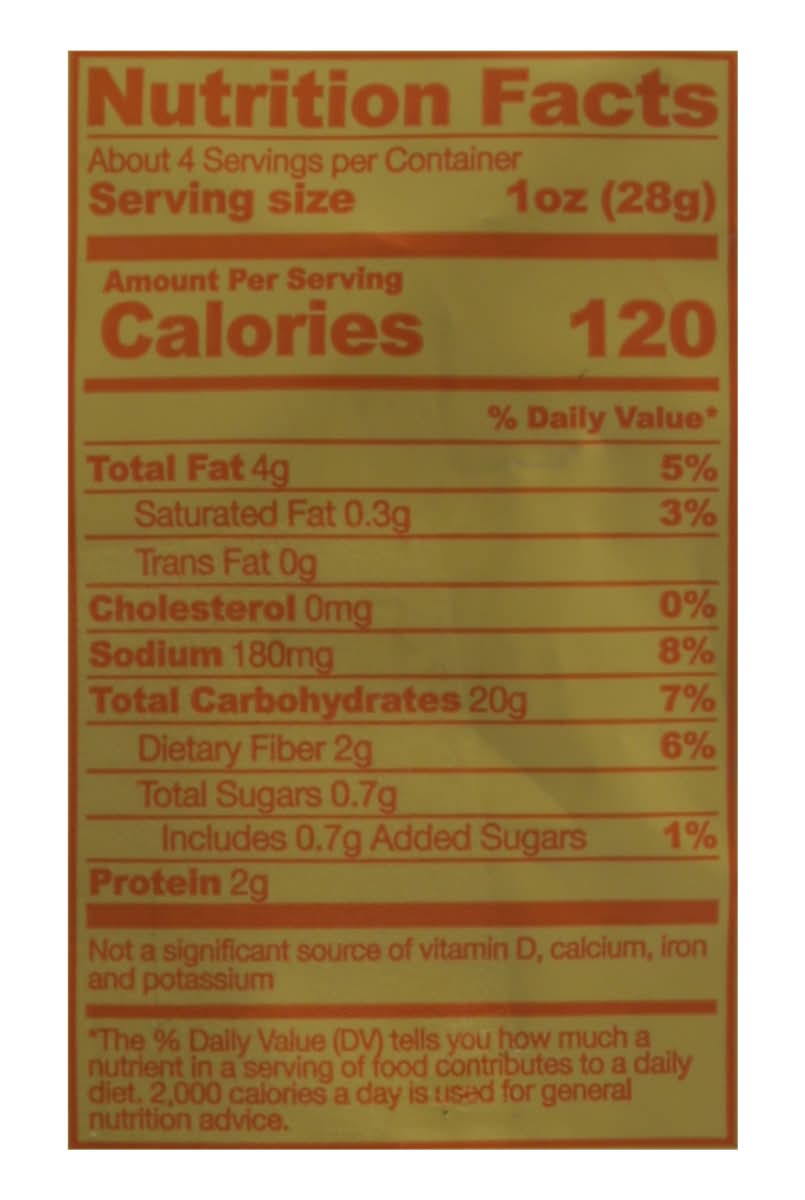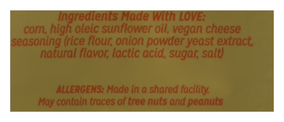 Ingredients: Ingredients Made with Love: Corn, High Oleic Sunflower Oil, Vegan Cheese Seasoning (Rice Flour, Onion Powder Yeast Extract, Natural Flavor, Lactic Acid, Sugar, Salt) Contains: Corn, Tree Nuts, Peanuts
