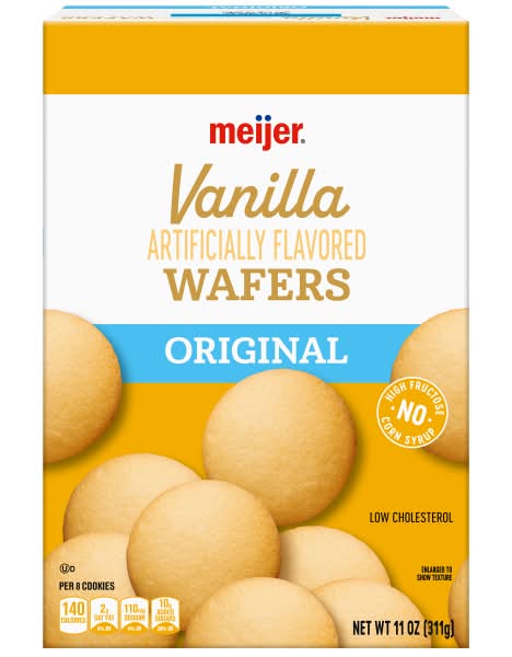 Meijer Original Vanilla Wafers are crispy with a sweet vanilla flavor. These wafers contain no trans-fat per serving and are low in cholesterol. They are suitable for dipping in coffee and can be enjoyed on the go, designed to be enjoyed without guilt.