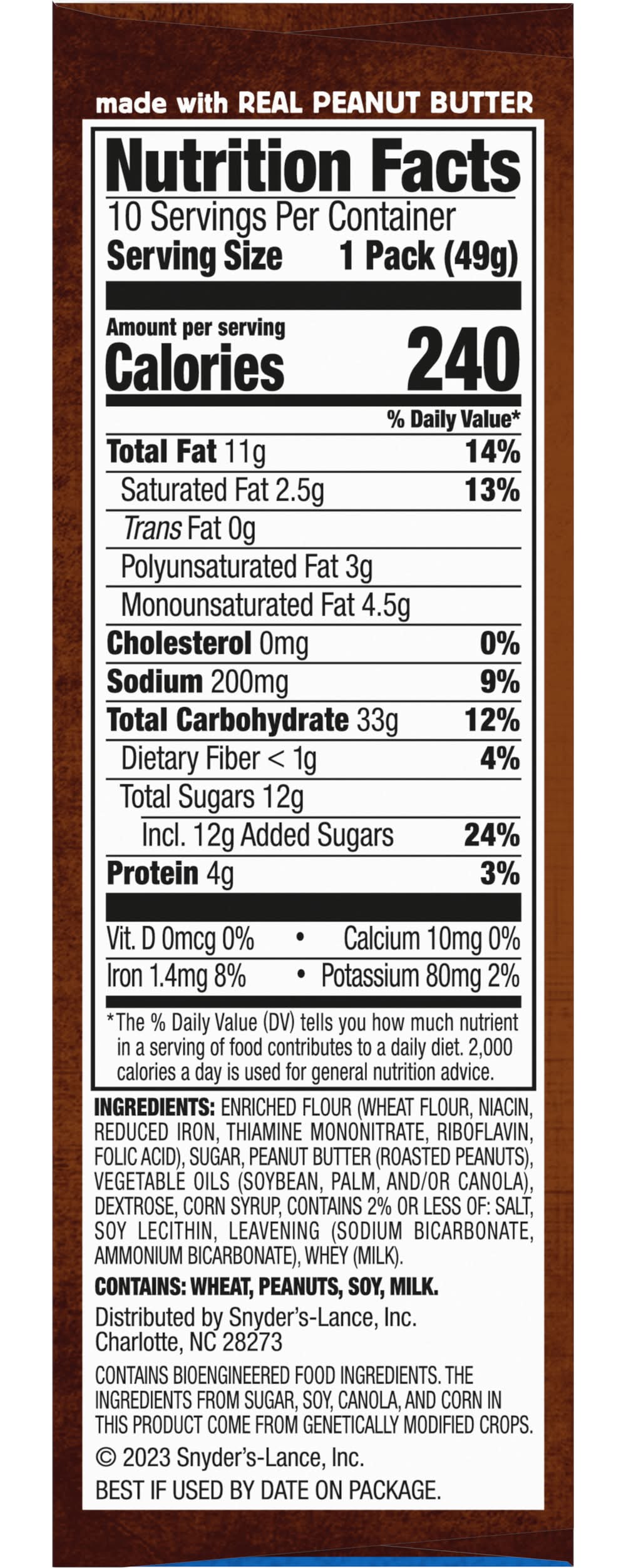 Ingredients: INGREDIENTS: ENRICHED FLOUR (WHEAT FLOUR, NIACIN, REDUCED IRON, THIAMINE MONONITRATE, RIBOFLAVIN, FOLIC ACID), SUGAR, PEANUT BUTTER (ROASTED PEANUTS), VEGETABLE OILS (SOYBEAN, PALM, AND/OR CANOLA), DEXTROSE, CORN SYRUP, CONTAINS 2% OR LESS OF: SALT, SOY LECITHIN, LEAVENING (SODIUM BICARBONATE, AMMONIUM BICARBONATE), WHEY (MILK), . CONTAINS: WHEAT, PEANUTS, SOY, MILK. Contains: CONTAINS: Gluten, Milk/Dairy, Peanut, Soybean, Wheat