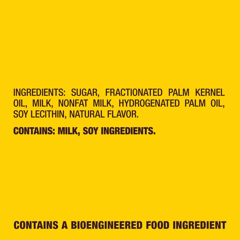 Ingredients: SUGAR, FRACTIONATED PALM KERNEL OIL, MILK, NONFAT MILK, HYDROGENATED PALM OIL, SOY LECITHIN, NATURAL FLAVOR. Contains: Peanuts, Milk, Soy