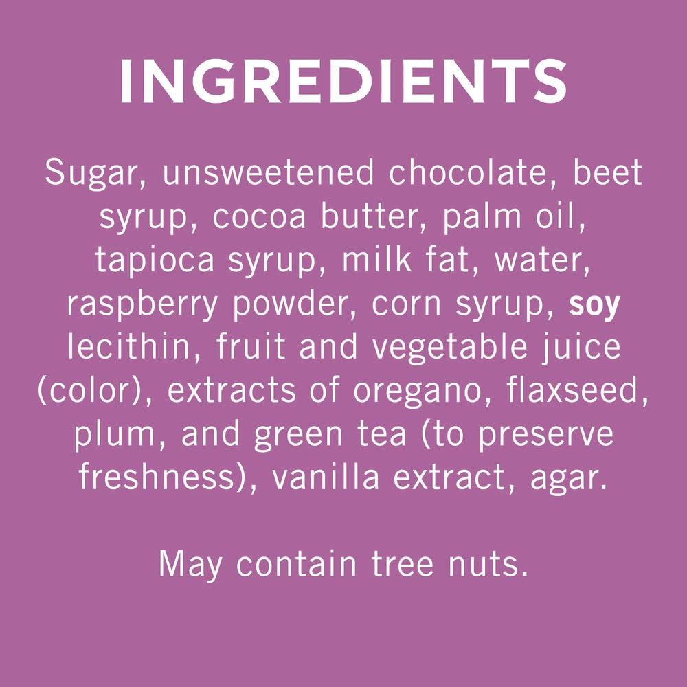 Ingredients: Ingredients: Sugar, unsweetened chocolate, beet syrup, cocoa butter, palm oil, tapioca syrup, milk fat, water, raspberry powder, corn syrup, soy lecithin, fruit and vegetable juice (color), extracts of oregano, flaxseed, plum, and green tea (to preserve freshness), vanilla extract, agar. Contains: Milk, Soybeans, Corn, Tree Nuts, Milk
