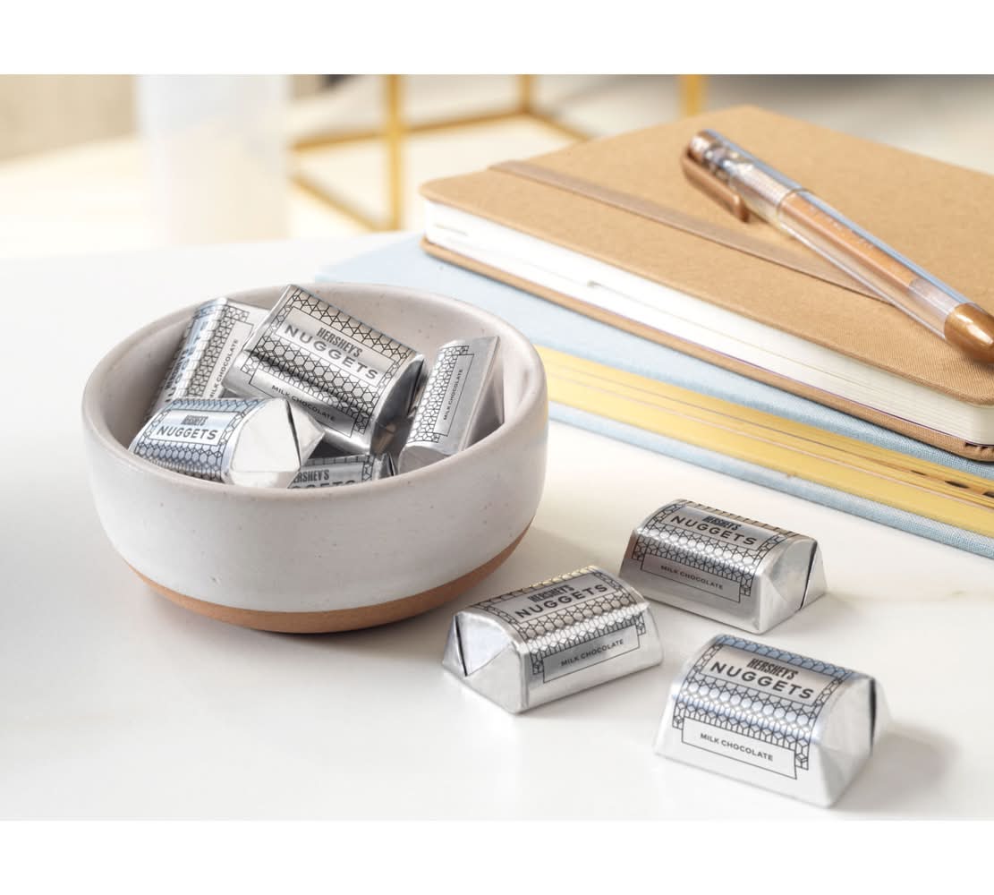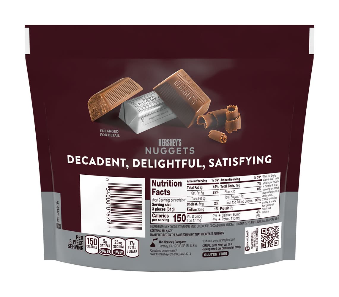 The HERSHEY'S NUGGETS milk chocolate candy share pack is filled with delicious chocolate treats any milk chocolate lover will adore. Each two-bite candy offers creamy, delightful milk chocolate individually wrapped in stunning silver foil. Dress your kitchen table up with a bowl or jar of HERSHEY'S NUGGETS goodies, surprise your co-workers with a filled candy dish or drop a handful of these treats into a party bag for an instant, anytime gift that everyone will love. • Flavor: Milk chocolate • The hershey company, Hershey,PA,17033-0815,USA