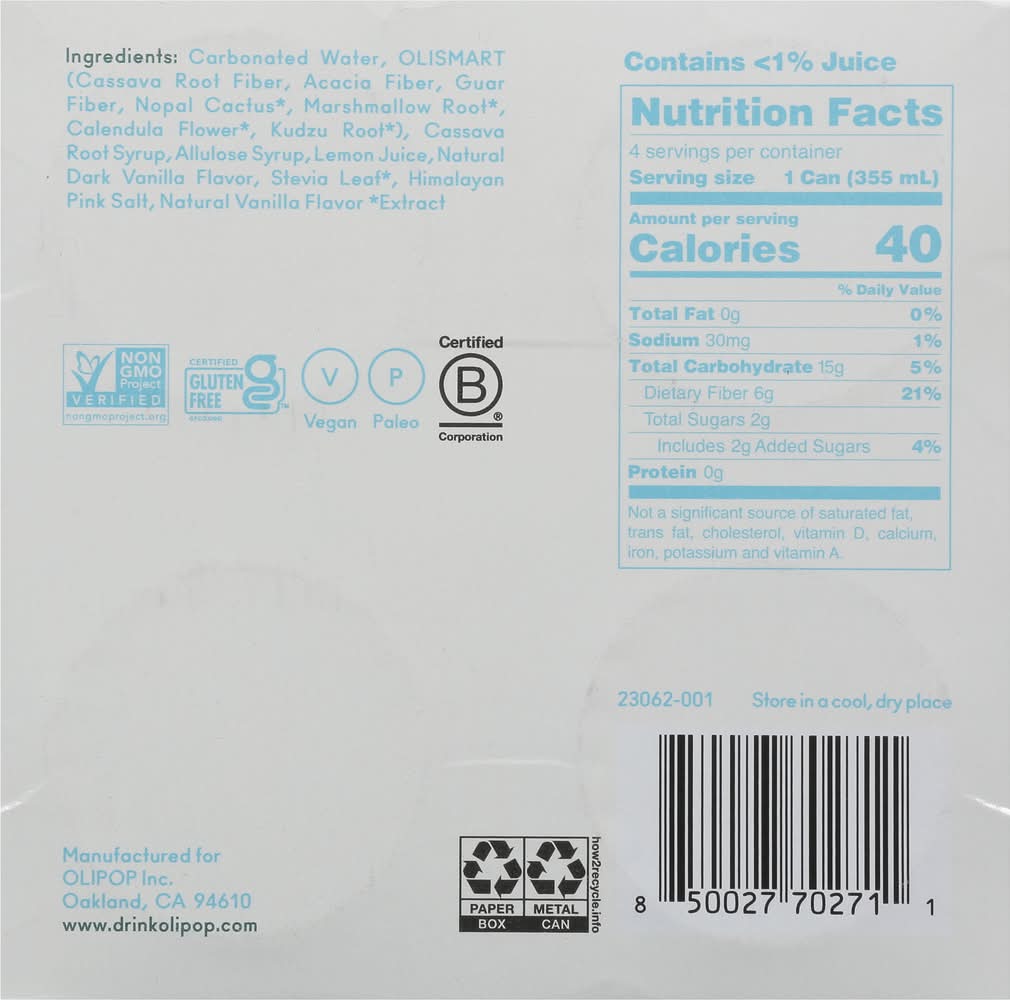 Finally, a new kind of soda that's delicious, refreshing, and actually good for you. OLIPOP combines the classic soda flavor you know and love with prebiotics, plant fiber, and botanicals to support your microbiome and digestive health. Better than spooning fluffy, sweet marshmallow cream straight out of the jar, our Cream Soda blends irresistibly decadent natural vanilla flavors with premium pure vanilla extract for a sumptuous, smooth soda you'll savor. • Pack size: 4 • OLIPOP Inc. , Oakland, CA 94610 • Packaging: Reusable