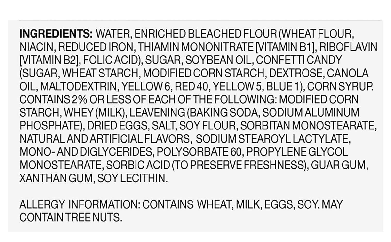 Ingredients: Water, Enriched Bleached Flour (Wheat Flour, Niacin, Reduced Iron, Thiamin Mononitrate [Vitamin B1], Riboflavin [Vitamin B2], Folic Acid), Sugar, Soybean Oil, Confetti Candy (Sugar, Wheat Starch, Modified Corn Starch, Dextrose, Canola Oil, Maltodextrin, Yellow 6, Red 40, Yellow 5, Blue 1), Corn Syrup, Contains 2% or Less of Each of the Following: Modified Corn Starch, Whey (Milk), Leavening (Baking Soda, Sodium Aluminum Phosphate), Dried Eggs, Salt, Soy Flour, Sorbitan Monostearate, Natural and Artificial Flavors, Sodium Stearoyl Lactylate, Mono-and Diglycerides, Polysorbate 60, Propylene Glycol Monostearate, Sorbic Acid (to Preserve Freshness), Guar Gum, Xanthan Gum, Soy Lecithin Contains: Wheat, Milk, Eggs, Soybeans, Corn, Tree Nuts