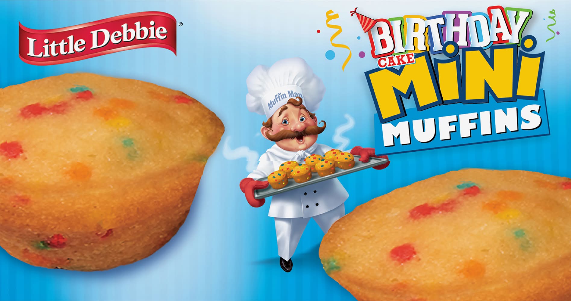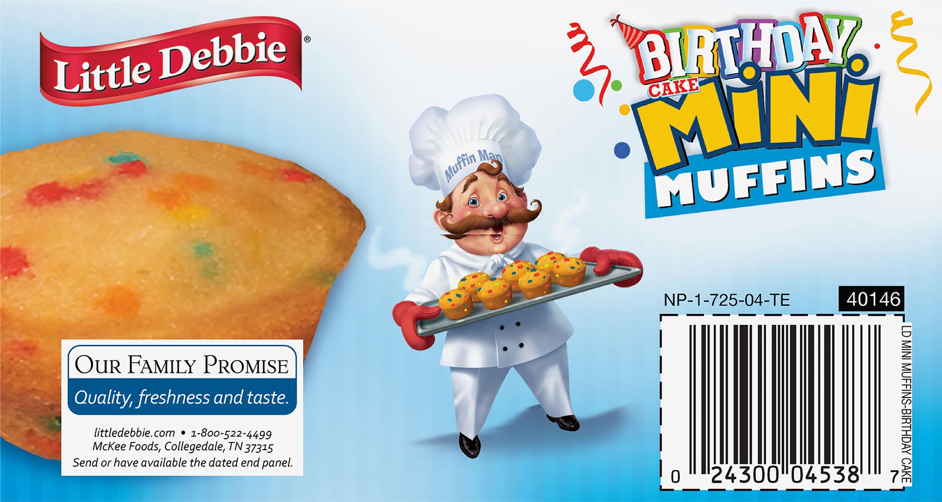 Muffins, Birthday Cake, Mini • Mckee Foods, PO Box 750,Collegedale,TN,37315 • Packaging: Reusable