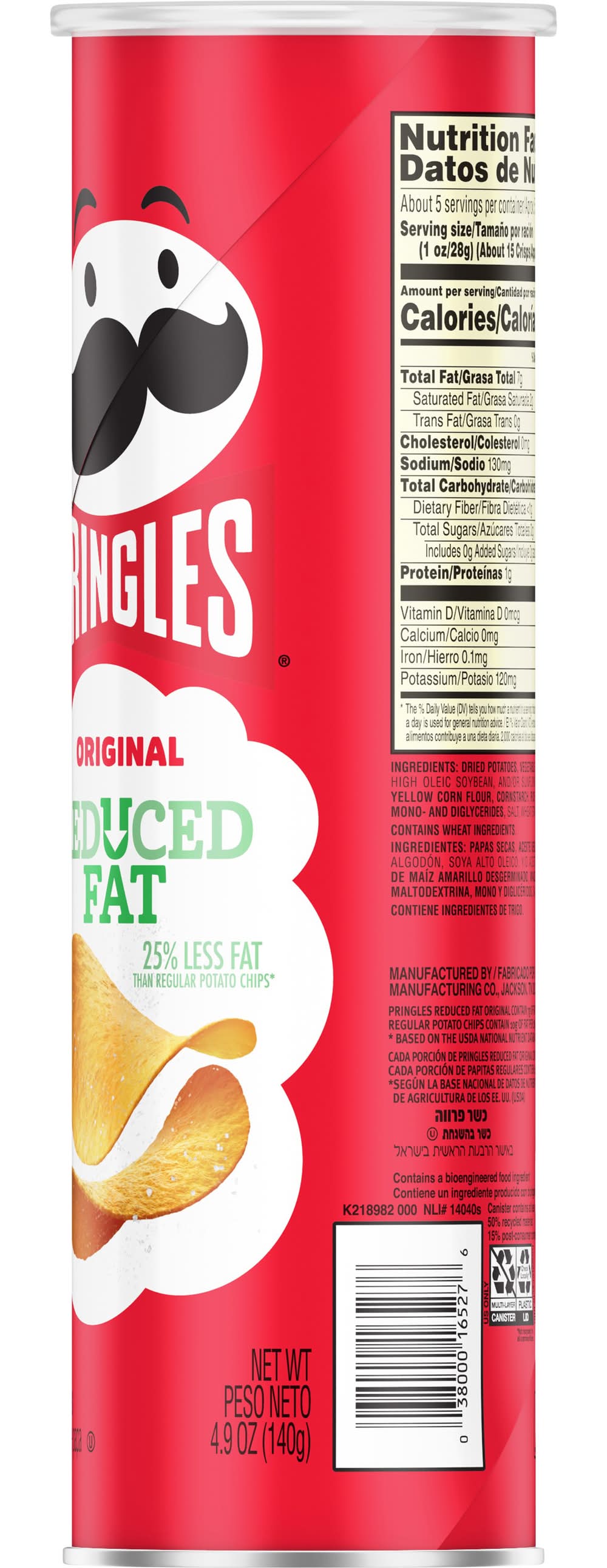 What comes next after the “pop” of a Pringles Reduced Fat can? The crisp, tantalizing taste of potato that hits the spot every time. Enjoy ingeniously shaped Pringles Reduced Fat Potato Crisps with 25% less fat than regular potato chips (Based on USDA National Nutrient Database. Pringles Reduced Fat Original contains 7g fat per 28g serving. Regular potato chips contain 10g fat per 28g serving). The convenient can lets you create snacking moments wherever and whenever; Bring a can to game time plus a few more for other Pringles fans. Pack a can in your pantry or work desk to crunch anytime. Share Pringles at your next get-together to turn up the flavor and fun among family and friends. Get your hands on Pringles Reduced Fat Potato Crisps for a tantalizing taste experience that keeps you coming back, stack after stack. Pringles manufacturing co., Jackson, TN,38301-5072