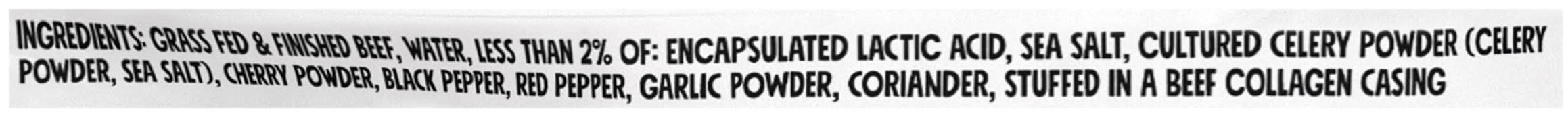 Ingredients: Grass Fed & Finished Beef, Water, Less than 2% of: Encapsulated Lactic Acid, Sea Salt, Cultured Celery Powder (Celery Powder, Sea Salt), Cherry Powder, Black Pepper, Red Pepper, Garlic Powder, Coriander, Stuffed in a Beef Collagen Casing Contains: Celery