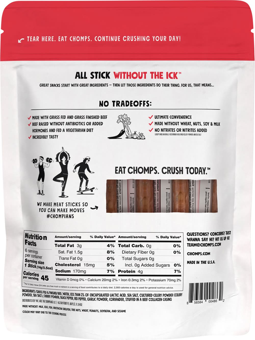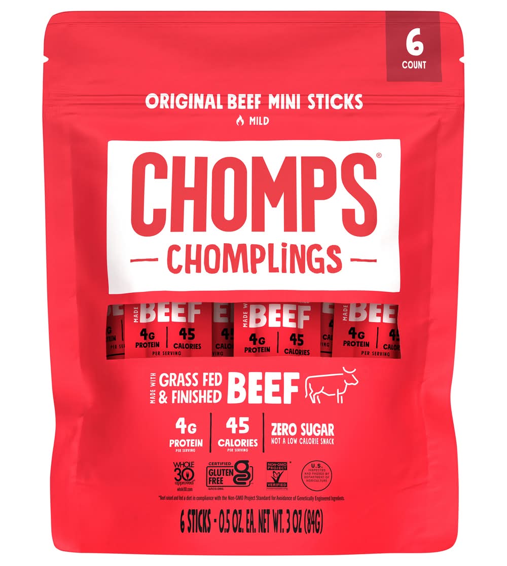 Each of Chomps mini beef sticks are filled with 100% non-GMO verified, grass-fed and grass-finished beef, 4g of protein, and only 45 calories. If youre looking for a delicious on-the-go snack thats packed with both protein and flavor, Chomps is the total snackage. So go ahead, take bigger bites! • Flavor: Original beef • We are the Chompians LLC, 465 Bayfront Pl, Naples, FL, 34102 • Packaging: Reusable
