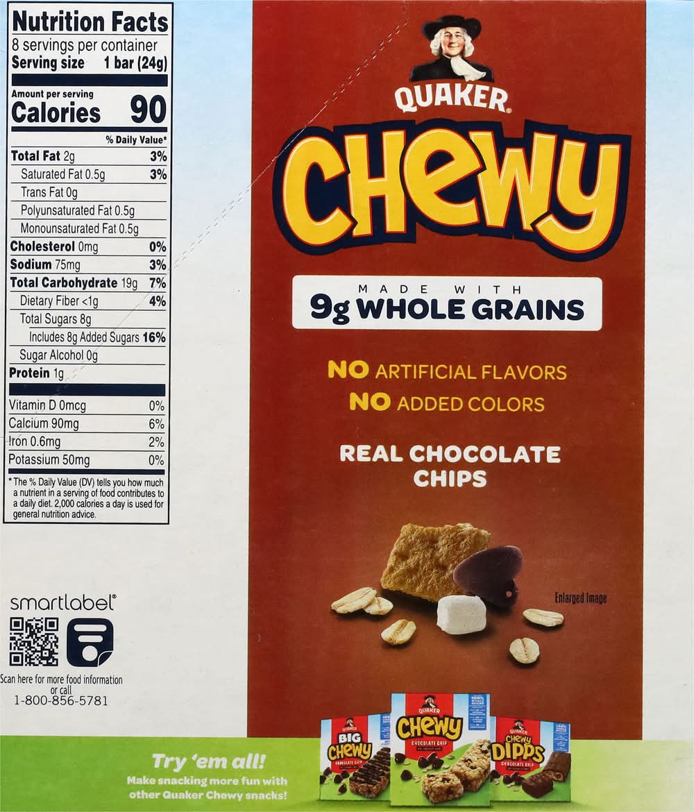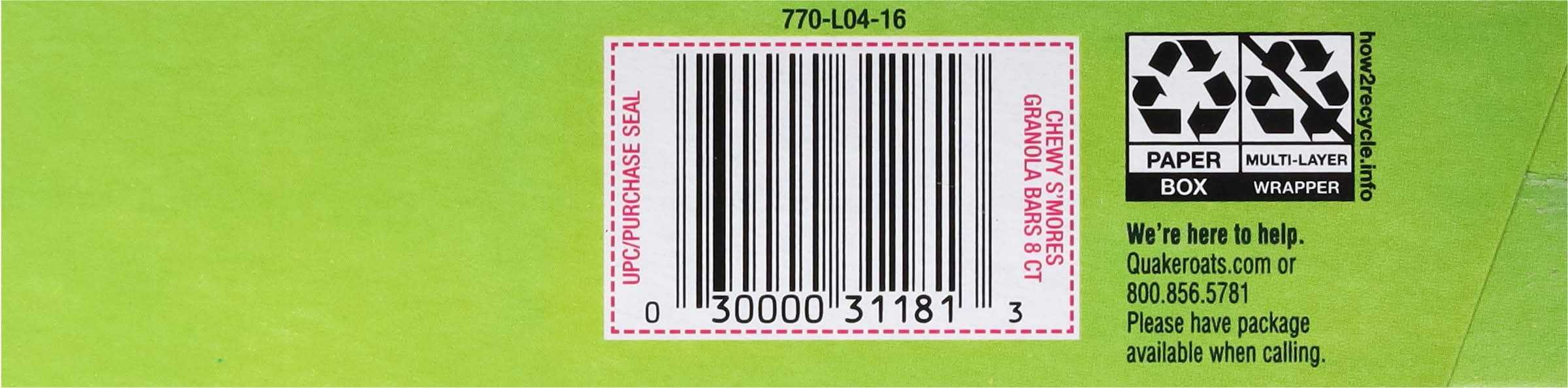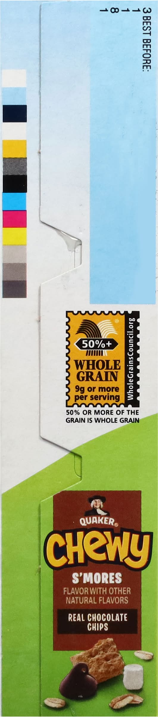 Satisfy your snack cravings and help fuel your day with Quaker Chewy S'mores Granola Bars. With 8 grams of whole grains and the family-favorite flavors of chocolate and gooey marshmallow, these bars are a great-tasting and wholesome snack. These granola bars are made without high-fructose corn syrup and each box comes with eight individually wrapped bars. • Flavor: S'mores • Pack size: 8 • The Quaker Oats Company, P.O. Box 049003,Chicago ,IL USA • Packaging: Reusable