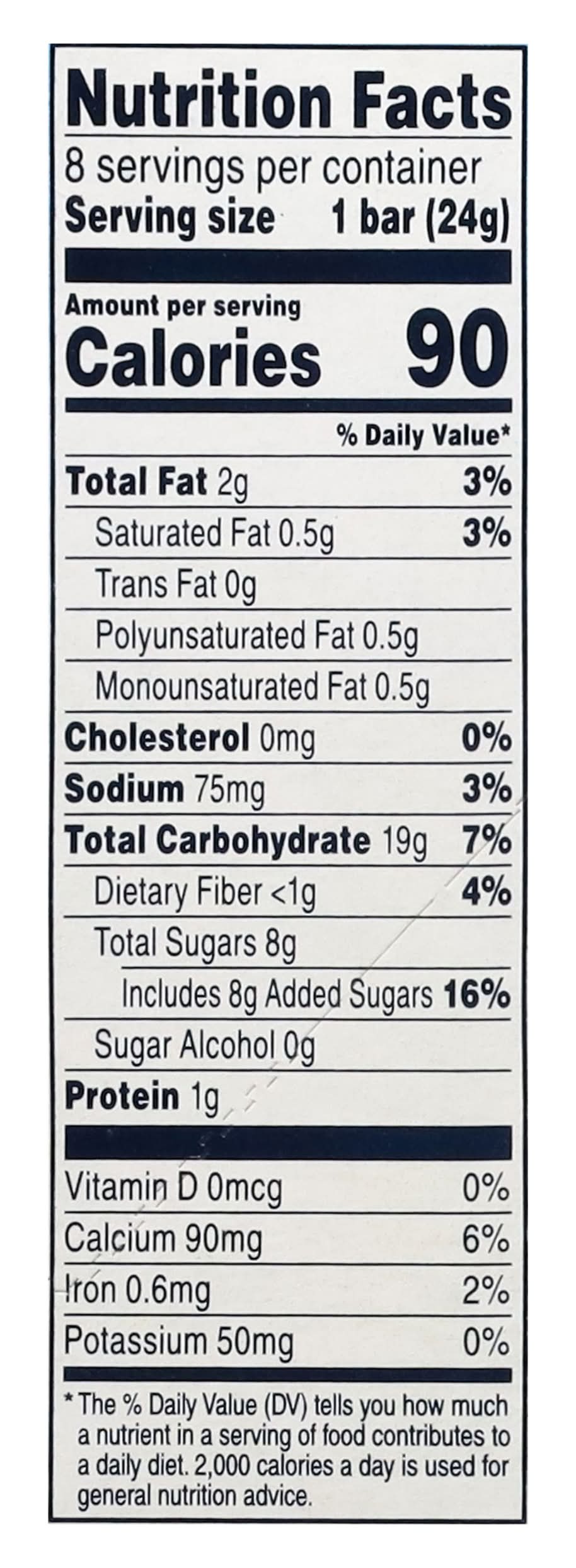 Ingredients: Granola (Whole Grain Oats, Brown Sugar, Brown Rice Crisp [Whole Grain Brown Rice Flour, Sugar, Salt], Whole Grain Wheat, Soybean Oil, Whole Wheat Flour, Baking Soda, Soy Lecithin, Nonfat Dry Milk), Corn Syrup, Semisweet Chocolate Chips (Sugar, Chocolate Liquor, Cocoa Butter, Soy Lecithin, Vanilla Extract), Brown Rice Crisp (Whole Grain Brown Rice Flour, Sugar, Salt), Sugar, Graham Cookie Pieces (Whole Wheat Flour, Sugar, Palm Oil, Honey, Baking Soda, Salt, Soy Lecithin, Natural Flavor), Dehydrated Marshmallow Bits (Sugar, Corn Syrup, Modified Corn Starch, Gelatin, Natural Flavor, Sodium Hexametaphosphate), Corn Syrup Solids, Invert Sugar, Glycerin, Contains 2% or Less of: Soybean Oil, Calcium Carbonate, Sorbitol, Salt, Natural Flavor (Contains Coconut), Molasses, Soy Lecithin, Tocopherols (to Preserve Freshness) Contains: Oat, Wheat, Soybeans, Milk, Corn, Peanuts, Tree Nuts