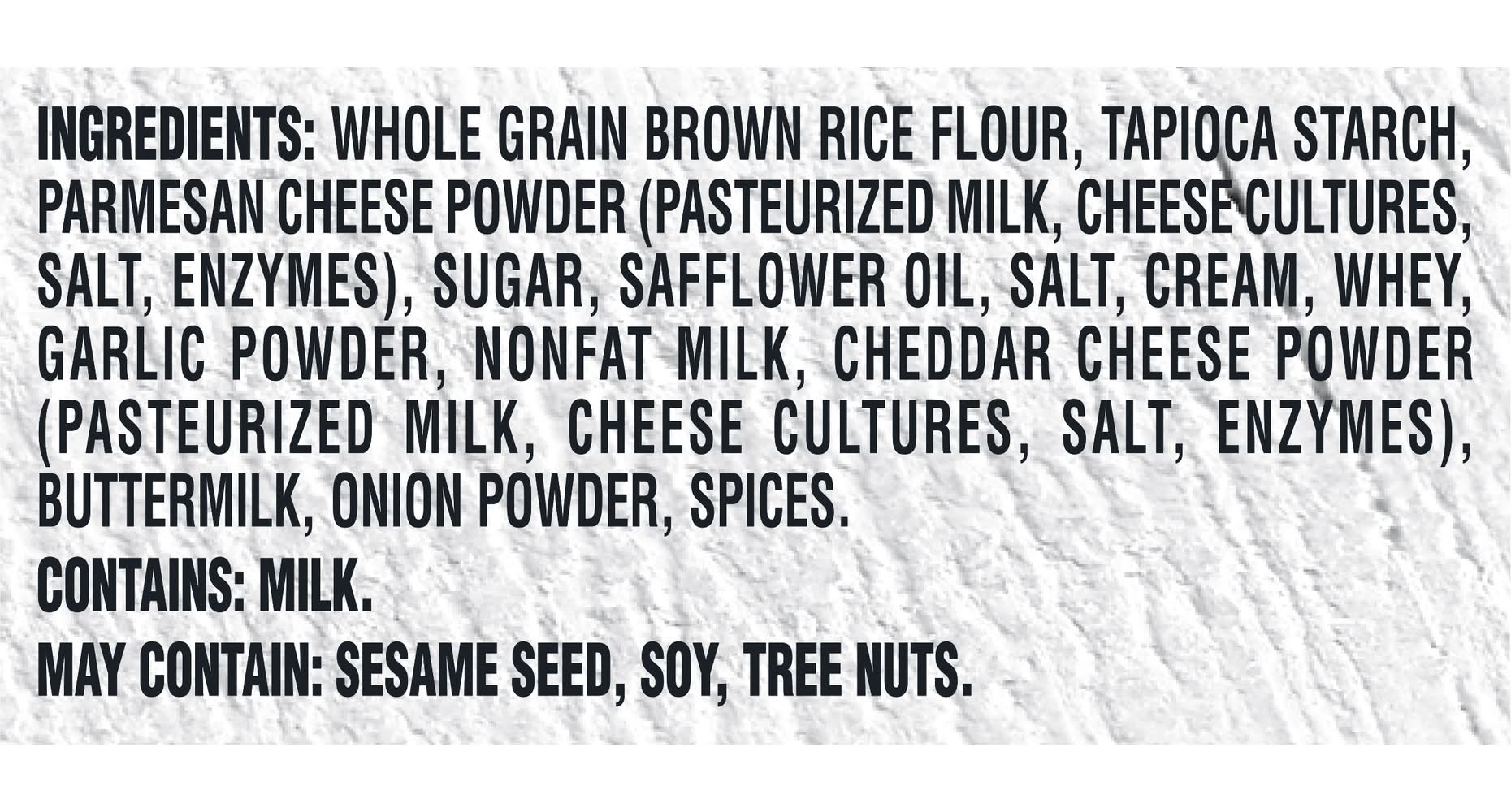 Ingredients: INGREDIENTS: WHOLE GRAIN BROWN RICE FLOUR, TAPIOCA STARCH, PARMESAN CHEESE POWDER (PASTEURIZED MILK, CHEESE CULTURES, SALT, ENZYMES), SUGAR, SAFFLOWER OIL, SALT, CREAM, WHEY, GARLIC POWDER, NONFAT MILK, CHEDDAR CHEESE POWDER (PASTEURIZED MILK, CHEESE CULTURES, SALT, ENZYMES), BUTTERMILK, ONION POWDER, SPICES.CONTAINS: MILK.MAY CONTAIN: SESAME SEED, SOY, TREE NUTS. Contains: CONTAINS: MILK.MAY CONTAIN: SESAME SEED, SOY, TREE NUTS.