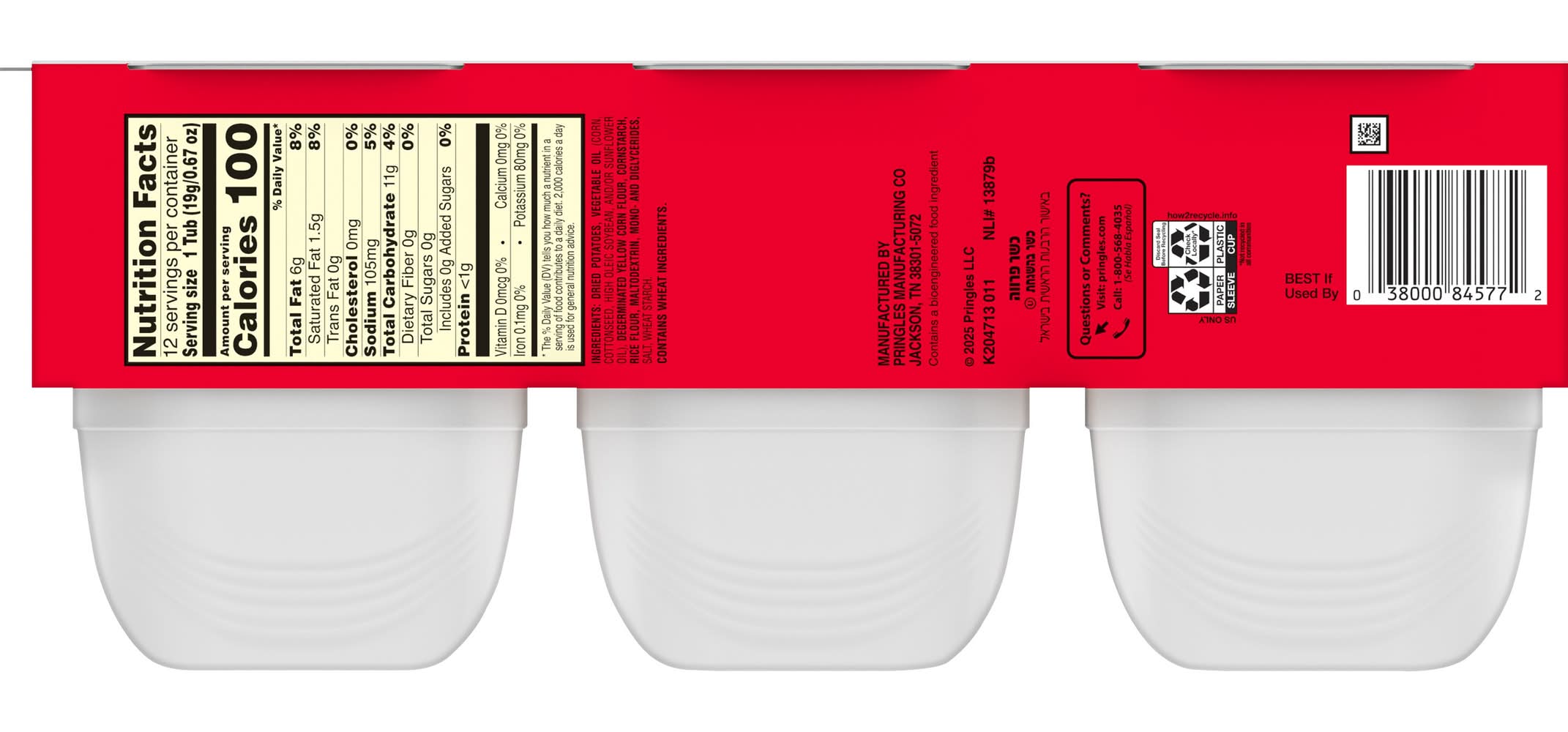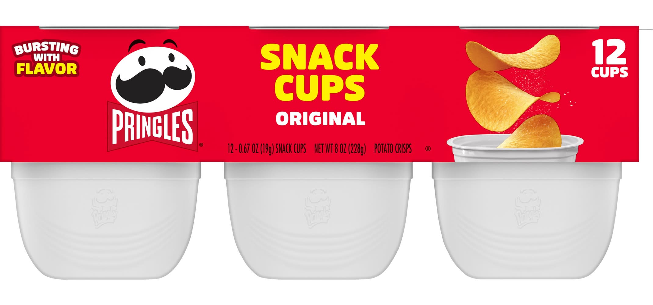 What comes next after opening a Pringles Original snack cup? The crisp, crunchy, hit-the-spot taste of potato seasoned with salty goodness. Ingeniously shaped Pringles potato crisps chips are insanely light, crispy, and never greasy. These crisps chips are perfectly salty and bursting with classic flavor. With these convenient, portable snack cups, it’s easy to create your own snacking moments wherever and whenever; Grab one as a pick-me-up for after school or pack as the ultimate car snack for road trips. Bring these snacks to game time and pack a few for other Pringles fans. Stash this snack in your work desk or pantry to enjoy anytime. Share Pringles at your next cookout or BBQ to turn up the flavor and fun among family and friends. Get your hands on Pringles Original Snack Cups potato crisps chips for an irresistible taste experience that keeps you coming back, stack after stack. • Pack size: 12 • Packaging: Reusable