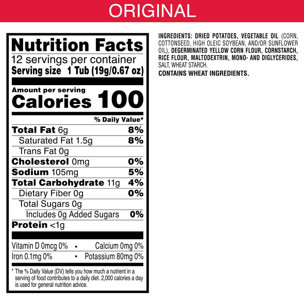 Ingredients: Dried Potatoes, Vegetable Oil (Corn, Cottonseed, High Oleic Soybean, and/or Sunflower Oil), Degerminated Yellow Corn Flour, Cornstarch, Rice Flour Maltodextrin Mono- and Diglycerides, Salt Wheat Starch. Contains: Wheat, Corn, Soybeans
