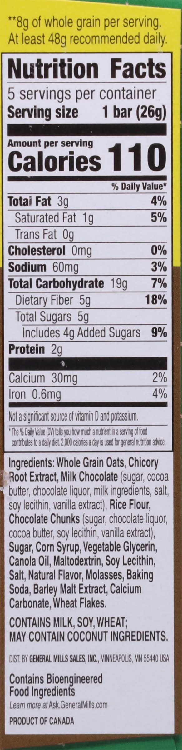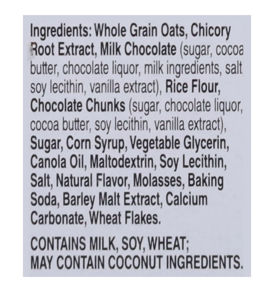 Ingredients: Whole Grain Oats, Chicory Root Extract, Milk Chocolate (Sugar, Cocoa Butter, Chocolate Liquor, Milk Ingredients, Salt, Soy Lecithin, Vanilla Extract), Rice Flour, Chocolate Chunks (Sugar, Chocolate Liquor, Cocoa Butter, Soy Lecithin, Vanilla Extract), Sugar, Corn Syrup, Vegetable Glycerin, Canola Oil, Maltodextrin, Soy Lecithin, Salt, Natural Flavor, Molasses, Baking Soda, Barley Malt Extract, Calcium Carbonate, Wheat Flakes Contains: Milk, Soybeans, Wheat, Oat, Barley, Tree Nuts, Coconuts
