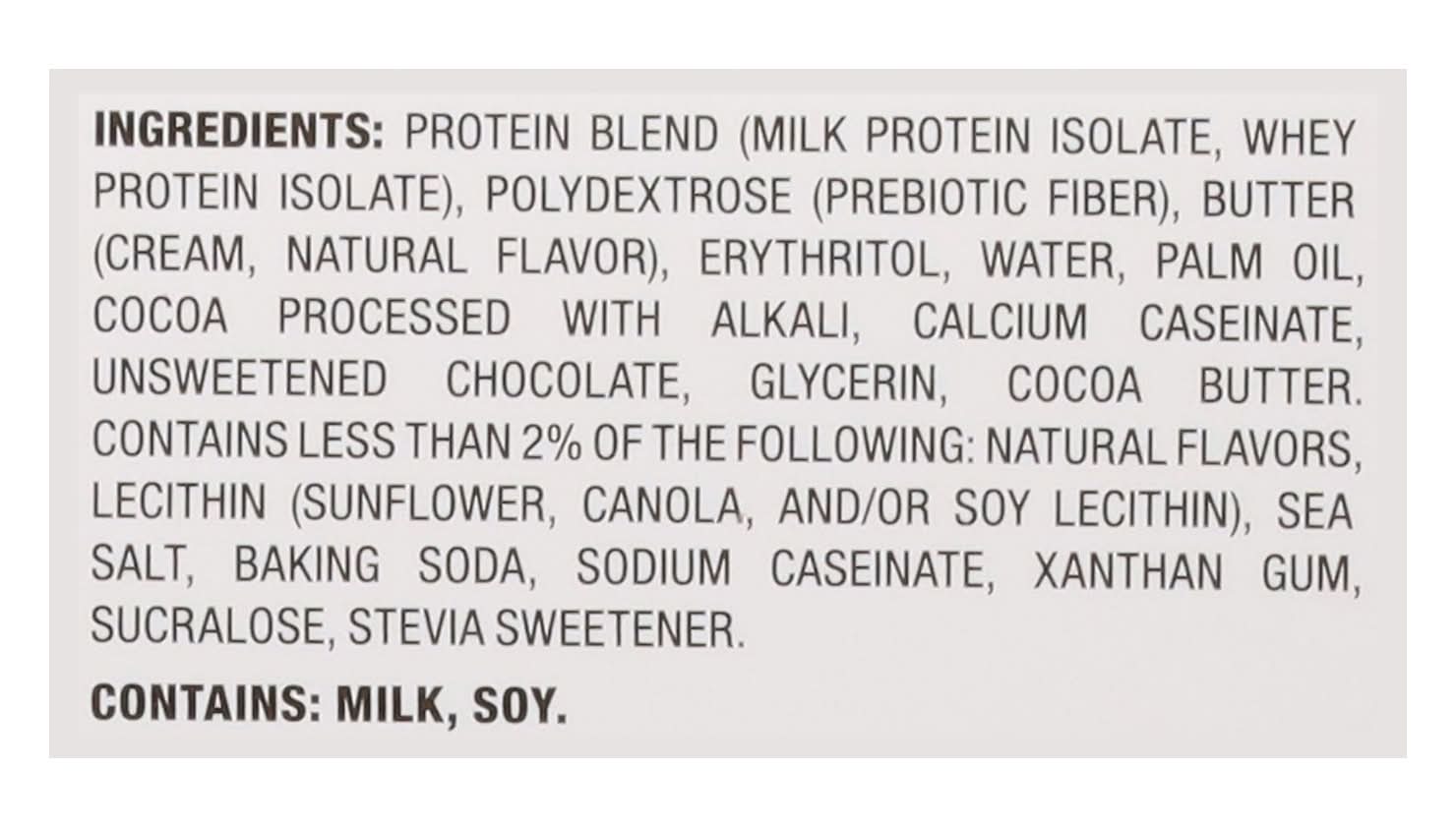 Ingredients: Protein Blend (Milk Protein Isolate, Whey Protein Isolate), Polydextrose (Prebiotic Fiber), Butter (Cream, Natural Flavor), Erythritol, Water, Palm Oil, Cocoa Processed with Alkali, Calcium Caseinate, Unsweetened Chocolate, Glycerin, Cocoa Butter, Contains Less than 2% of the Following: Natural Flavors, Lecithin (Sunflower, Canola, and/or Soy Lecithin), Sea Salt, Baking Soda, Sodium Caseinate, Xanthan Gum, Sucralose, Stevia Sweetener Contains: Milk, Soybeans, Eggs, Wheat, Peanuts, Tree Nuts