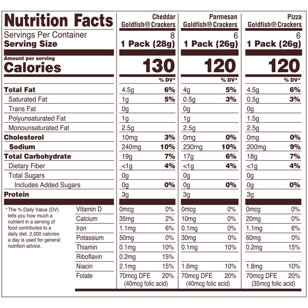 Enjoy a variety of flavors with Each pack contains a selection of Pizza, Cheddar, and made with 100% real cheese. The Cheddar flavor is 130 calories per pack, while both the Parmesan and Pizza flavors are 120 calories per pack. It is important to note that the product contains bioengineered food ingredients including sugar, soy, and canola. These crackers are baked in the USA. • Flavor: Assorted • Pepperidge Farm Inc, Norwalk,CT,06856 • Packaging: Reusable