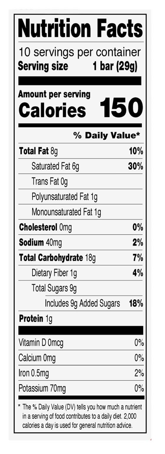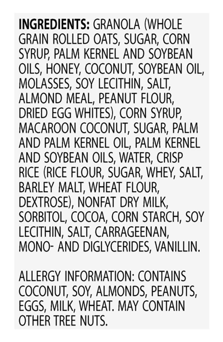 Ingredients: Granola (Whole Grain Rolled Oats, Sugar, Corn Syrup, Palm Kernel and Soybean Oils, Honey, Coconut, Soybean Oil, Molasses, Soy Lecithin, Salt, Almond Meal, Peanut Flour, Dried Egg Whites), Corn Syrup, Macaroon Coconut, Sugar, Palm and Palm Kernel Oil, Palm Kernel and Soybean Oils, Water, Crisp Rice (Rice Flour, Sugar, Whey, Salt, Barley Malt, Wheat Flour, Dextrose), Nonfat Dry Milk, Sorbitol, Cocoa, Corn Starch, Soy Lecithin, Salt, Carrageenan, Mono- and Diglycerides, Vanillin Contains: Tree Nuts, Coconuts, Soybeans, Tree Nuts, Almonds, Peanuts, Eggs, Milk, Wheat, Corn, Barley, Tree Nuts