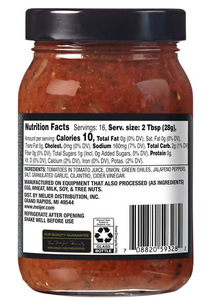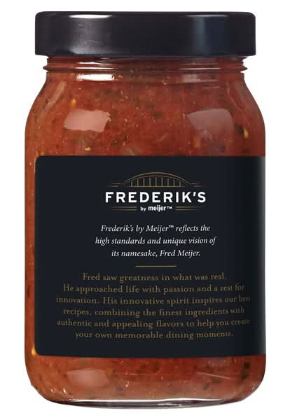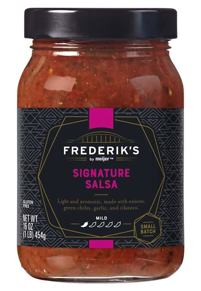 Frederiks By Meijer Signature Mild Salsa (16 oz) is a mild-flavored salsa, crafted in small batches to ensure quality. This salsa includes a blend of onions, green chiles, garlic, and cilantro, contributing to its light and aromatic flavor profile. It is an ideal accompaniment for Mexican style dishes and can be used to enhance a nacho night or served with tortilla chips.