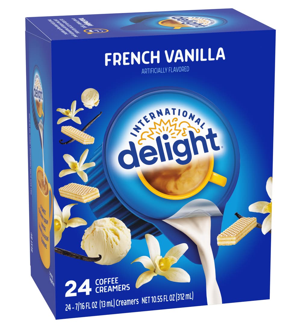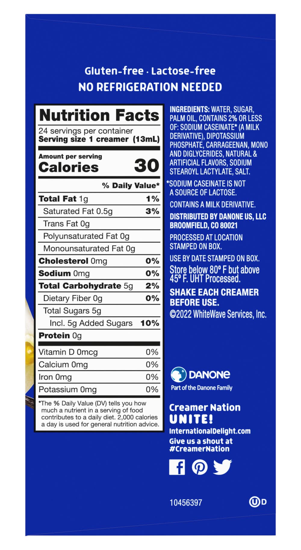 Wherever you go, stay true to your International Delight French Vanilla Coffee Creamer Singles. These pre-portioned vanilla creamer singles bring a world of flavor to your coffee for every adventure no refrigeration needed. Every sip is filled with vanilla flavor so bold, you'll be swept off your feet. And creaminess so delightful, you'll wonder why black coffee ever existed. Stash the convenient single serve flavored creamer singles in your purse or your pocket. With the dreamy deliciousness of our French Vanilla creamer singles, you'll be ready for flavor emergencies no matter where you are. Plus, International Delight Creamers are lactose free and gluten free, so they're easy to share. Stock up on International Delight Coffee Creamer Singles to flavor up your cup wherever you go. • Flavor: French vanilla • Whitewave Foods, Broomfield,CO,80021