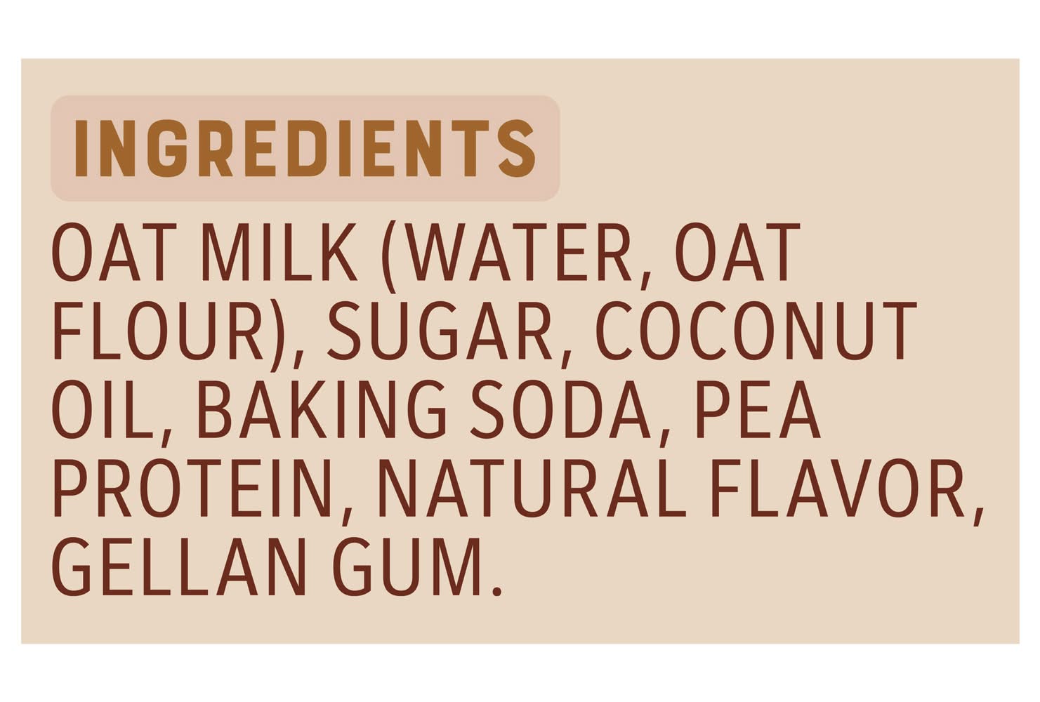 Ingredients: Oat Milk (Water, Oat Flour), Sugar, Coconut Oil, Baking Soda, Pea Protein, Natural Flavor, Gellan Gum Contains: Oat, Tree Nuts, Coconuts