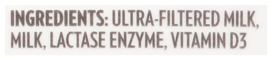 Ingredients: Ultra-Filtered Milk, Milk, Lactase Enzyme, Vitamin D3 Contains: milk