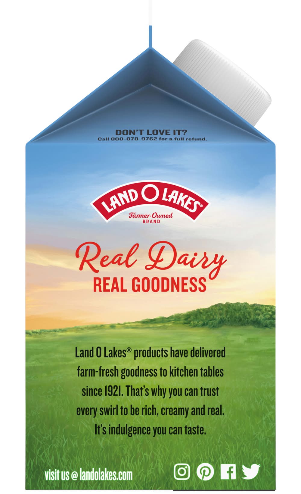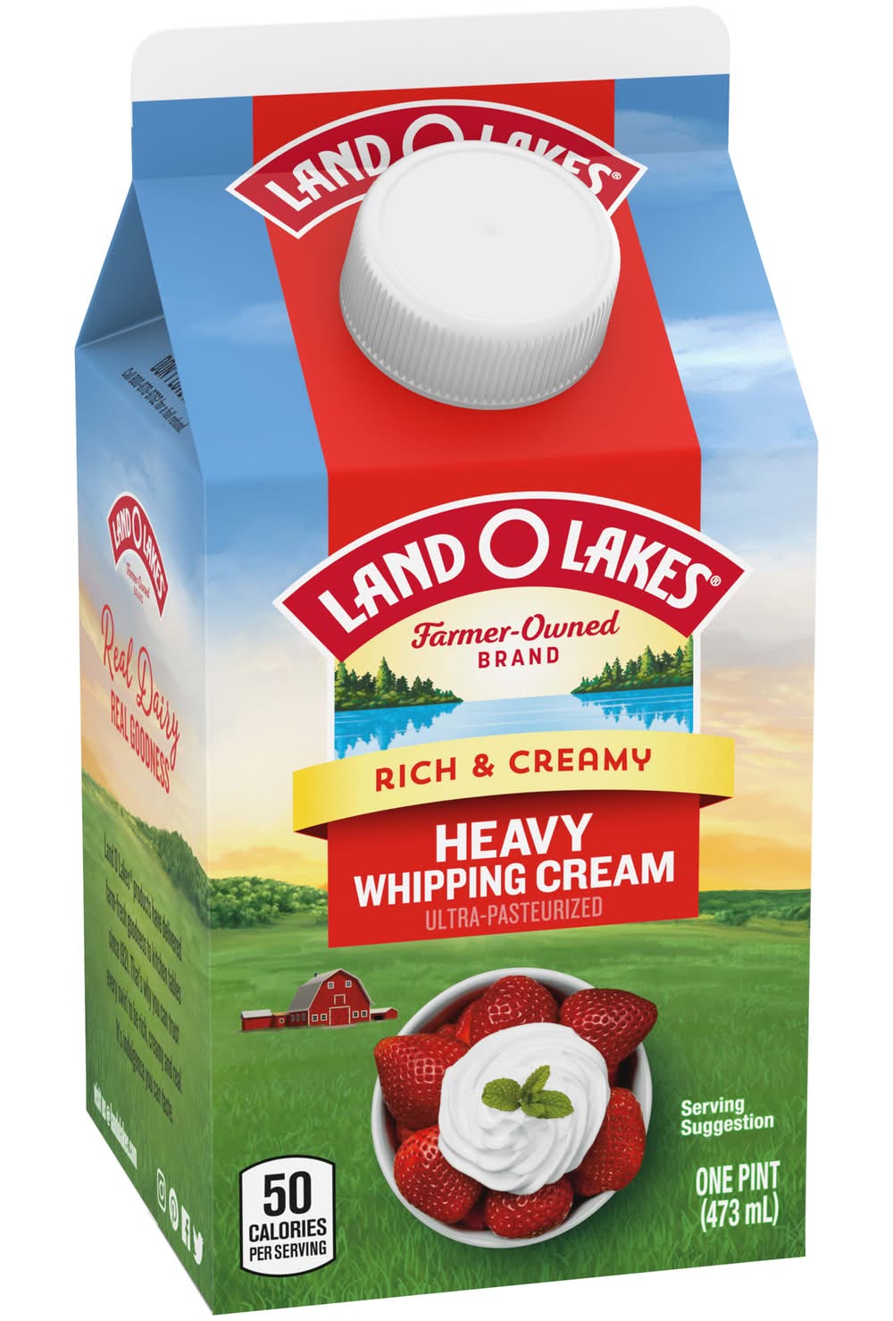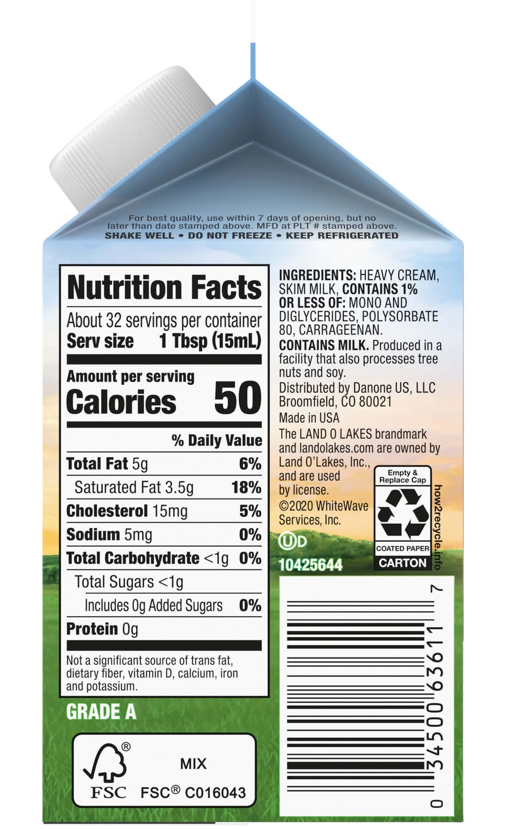 50 Calories per serving. Rich and Creamy: In soups. On pies. In coffee. With fruit. In sauces - You get the idea. Real dairy. Real goodness. Land O Lakes products have delivered farm-fresh goodness to kitchen tables since 1921. That's why you can trust every swirl to be rich, creamy and real. It's indulgence you can taste. • Danone Us, LLC, Broomfield CO 80021 • Packaging: Reusable