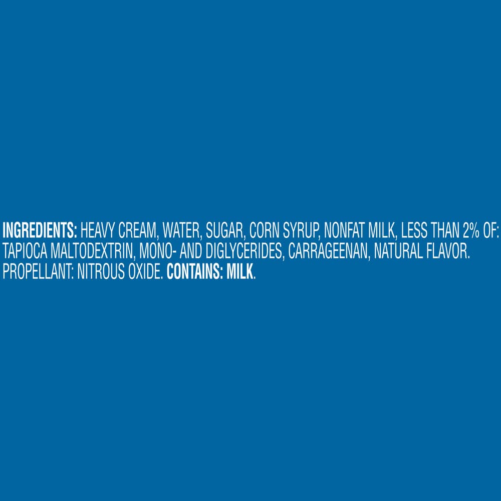 Ingredients: Heavy Cream, Water, Sugar, Corn Syrup, Nonfat Milk, Less than 2% of: Mono- and Diglycerides, Natural Flavor, Carrageenan. PROPELLANT: Nitrous Oxide. CONTAINS: MILK. Contains: Milk