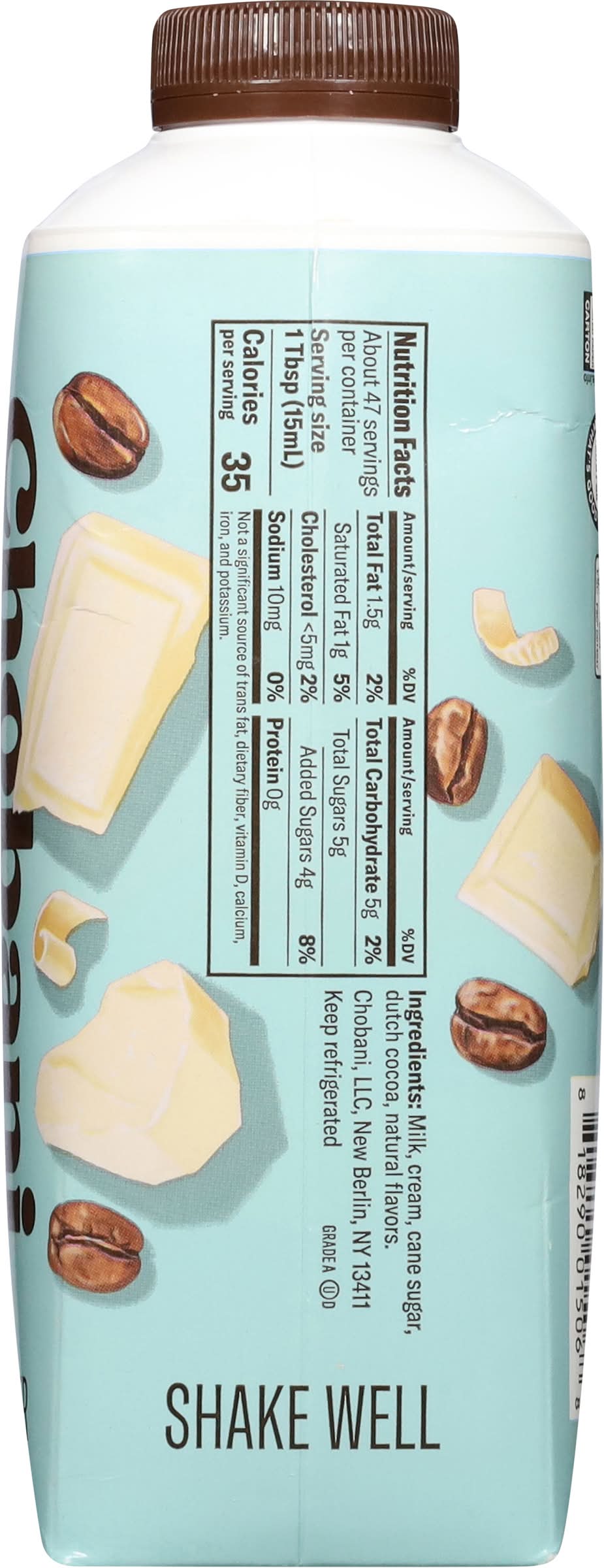 Coffee creamer with real cream. Flavored with other natural flavors. No artificial flavors. Rich & creamy. Authentically crafted. No artificial sweeteners. No preservatives. No emulsifiers. No rBST (Milk from rBST-treated cows is not significantly different). No carrageenan. Simple and delicious. Good for great mornings. Makes every sip of coffee more delicious than the last. Naturally. Packaged sustainably. In recyclable cartons made with paperboard from FSC-certified forests and other controlled sources. • Flavor: White chocolate mocha • Chobani, LLC, Norwich, 147 NY-320, Norwich, NY 13815 • Packaging: Reusable