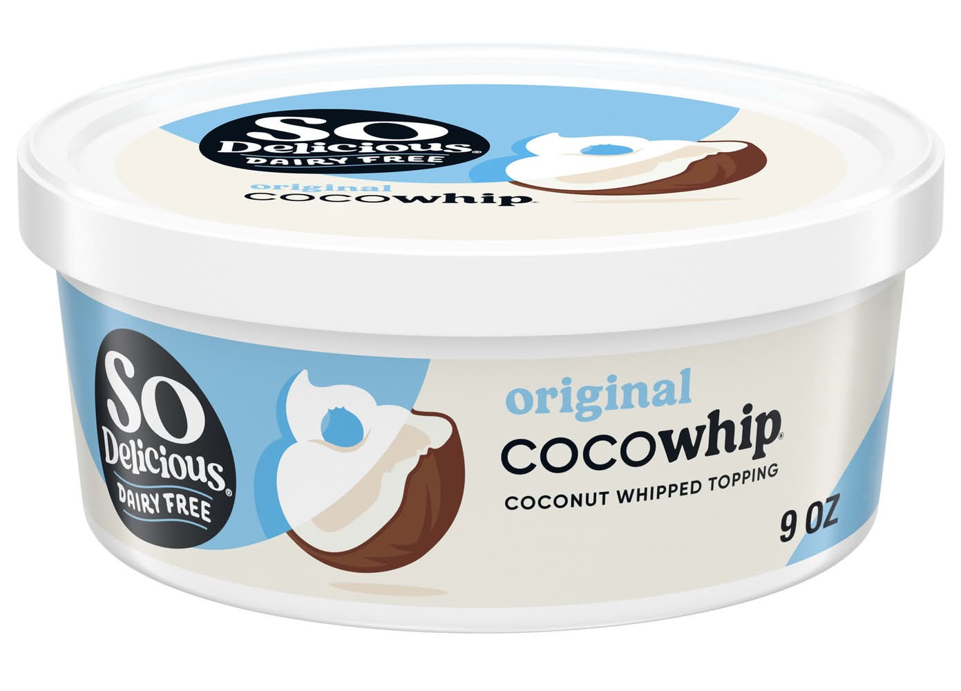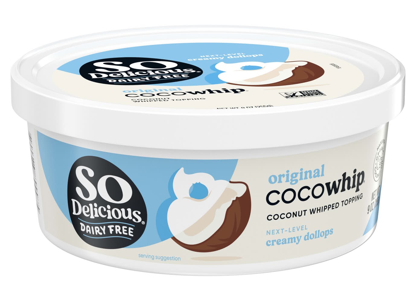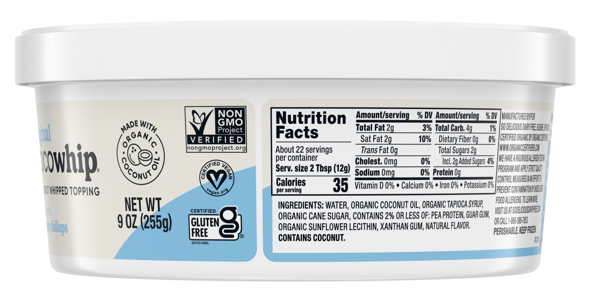Take your favorite desserts and beverages to new heights with So Delicious Dairy Free Coco whip Original, the fluffy topping that goes great on ice cream, shakes, pies, crepes, berries, and more. We make our nondairy Coco Whip with organic coconut oil and other plant-based ingredients, so you can enjoy your treats. With only 30 calories per serving, Coco Whip Original provides the perfect, low-calorie opportunity to satisfy your sweet tooth. So Delicious, Eugene, OR, 97402