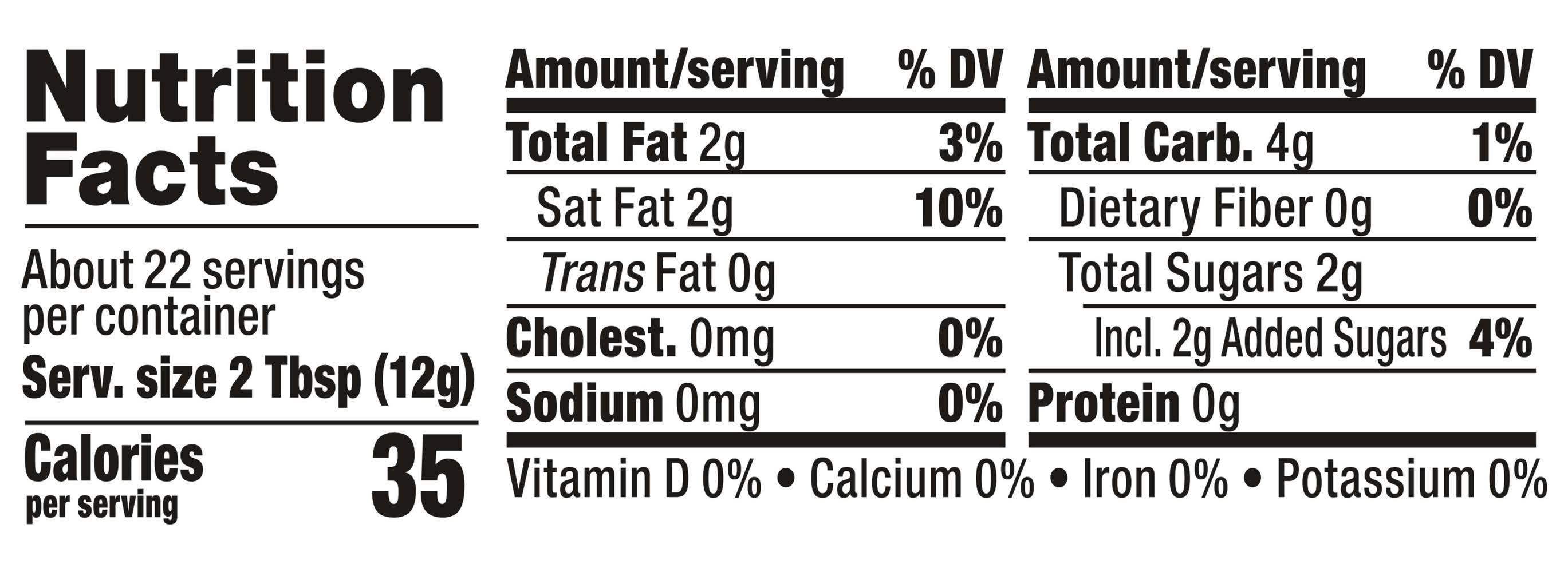 Ingredients: INGREDIENTS: FILTERED WATER, ORGANIC COCONUT OIL, ORGANIC TAPIOCA SYRUP, ORGANIC CANE SUGAR, PEA PROTEIN, GUAR GUM, SUNFLOWER LECITHIN, XANTHAN GUM, NATURAL FLAVOR Contains: WHEAT, PEANUTS AND SOY., Coconut