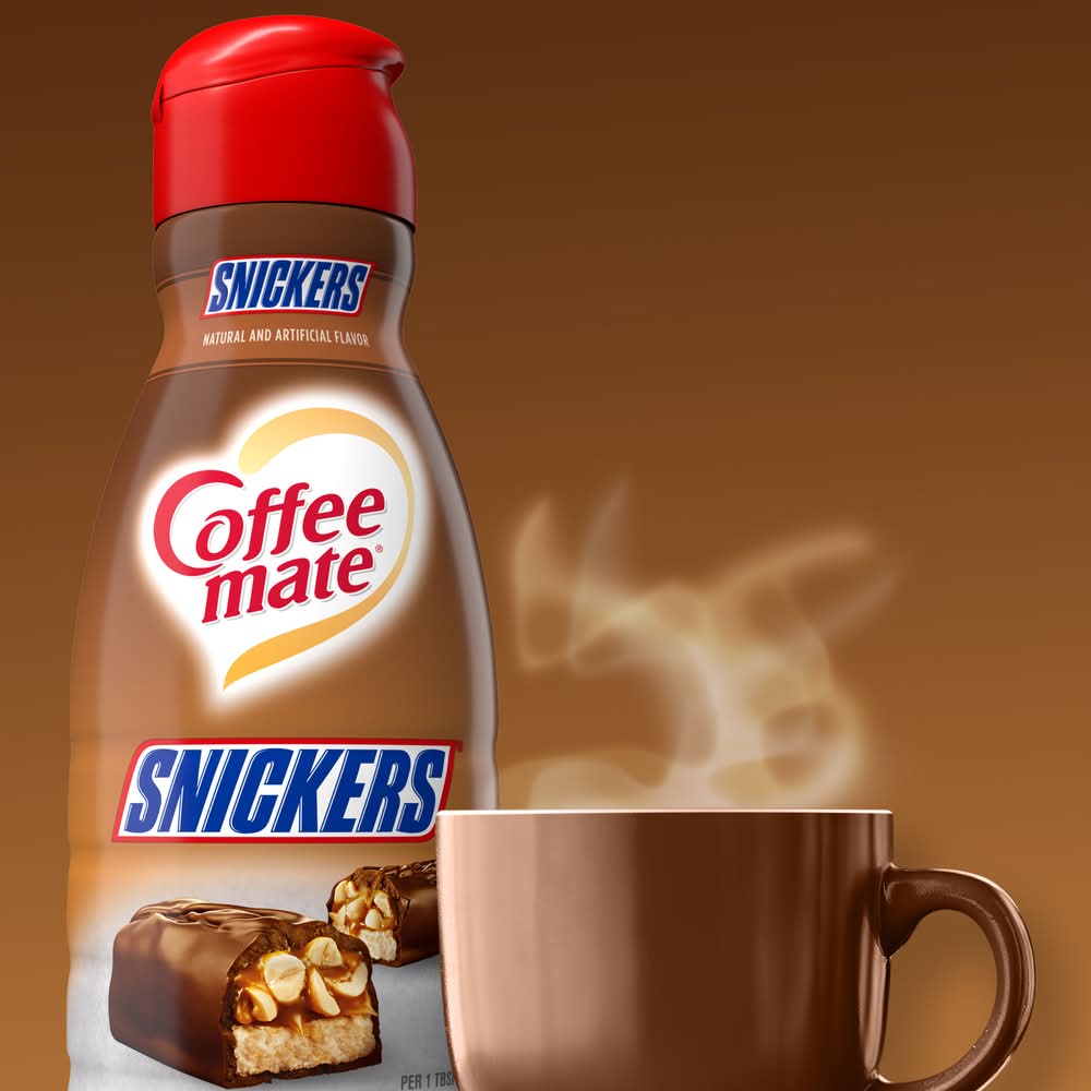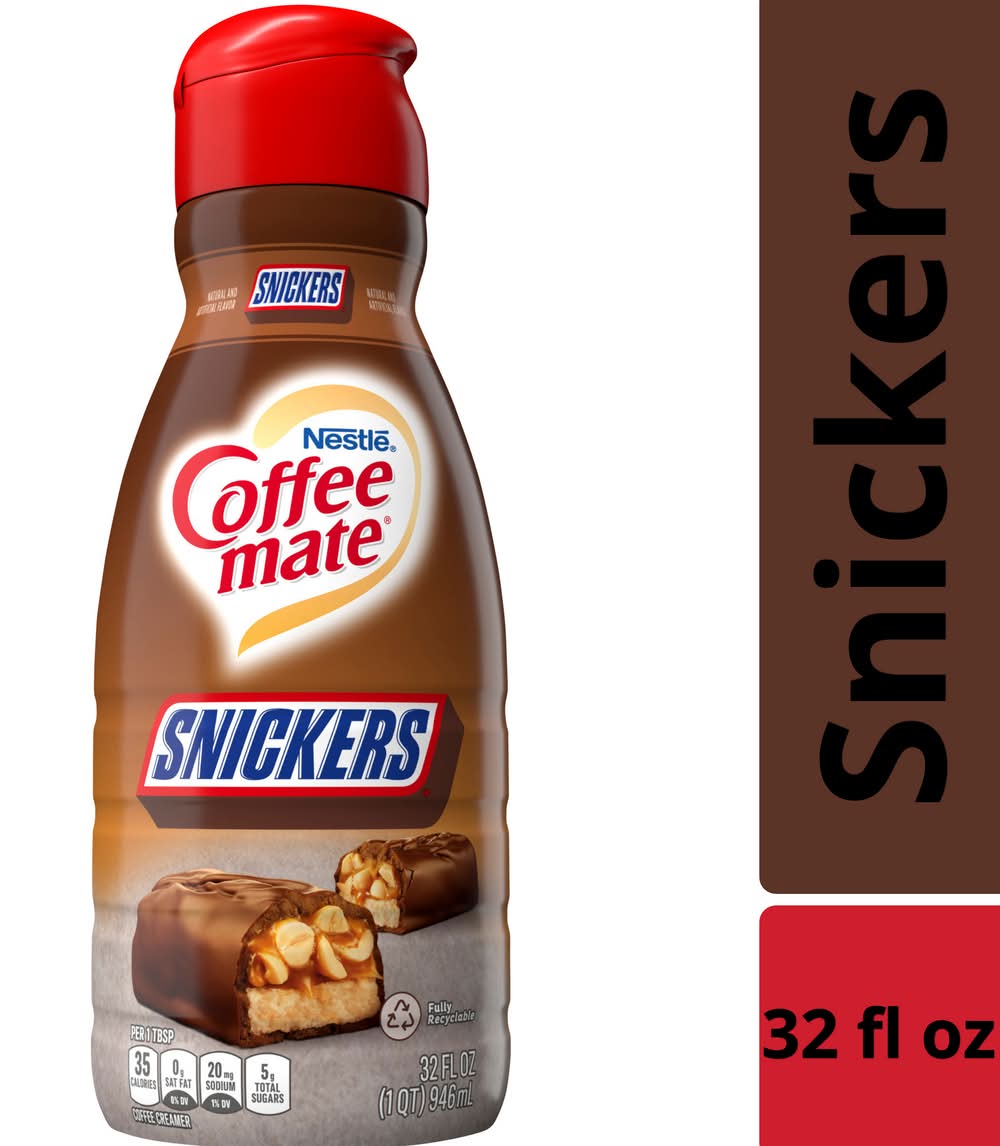 Coffee mate Snickers Flavored Liquid Coffee Creamer is the perfect way to create a delicious cup of candy-inspired coffee perfection. Coffee mate Snickers flavored coffee creamer adds the taste of warm caramel, indulgent chocolate, and savory peanuts to your morning cup. This non dairy creamer is gluten free and cholesterol free. Coffee mate liquid creamer provides an easy way to transform your hot or iced coffee into flavorful deliciousness, whether it's your morning cup of coffee or afternoon pick-me-up. The decadent taste of Snickers is perfect for a delicious morning ritual. Coffee mate coffee creamer comes in a convenient bottle with a snap lid to allow for easy pouring and storage. Store Coffee mate Snickers creamer in the refrigerator. • Flavor: Snickers • Nestle, St. Louis, MO 63164 • Packaging: Reusable