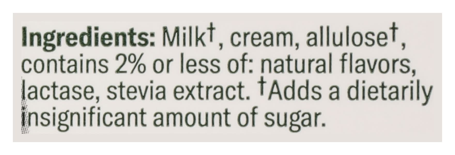 Ingredients: Milk (a), Cream, Allulose(a), Contains 2% or Less of: Natural Flavors, Lactase, Stevia Extract. (a) Adds a Dietarily Insignificant Amount of Sugar Contains: Milk