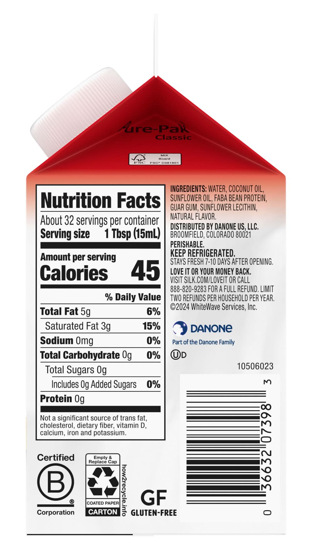 Ingredients: INGREDIENTS: Filtered Water, Coconut Oil, Sunflower Oil, Faba Bean Protein, Guar Gum, Sunflower Lecithin, Natural Flavors. Contains: Produced in a facility that also processes tree nuts and soy.