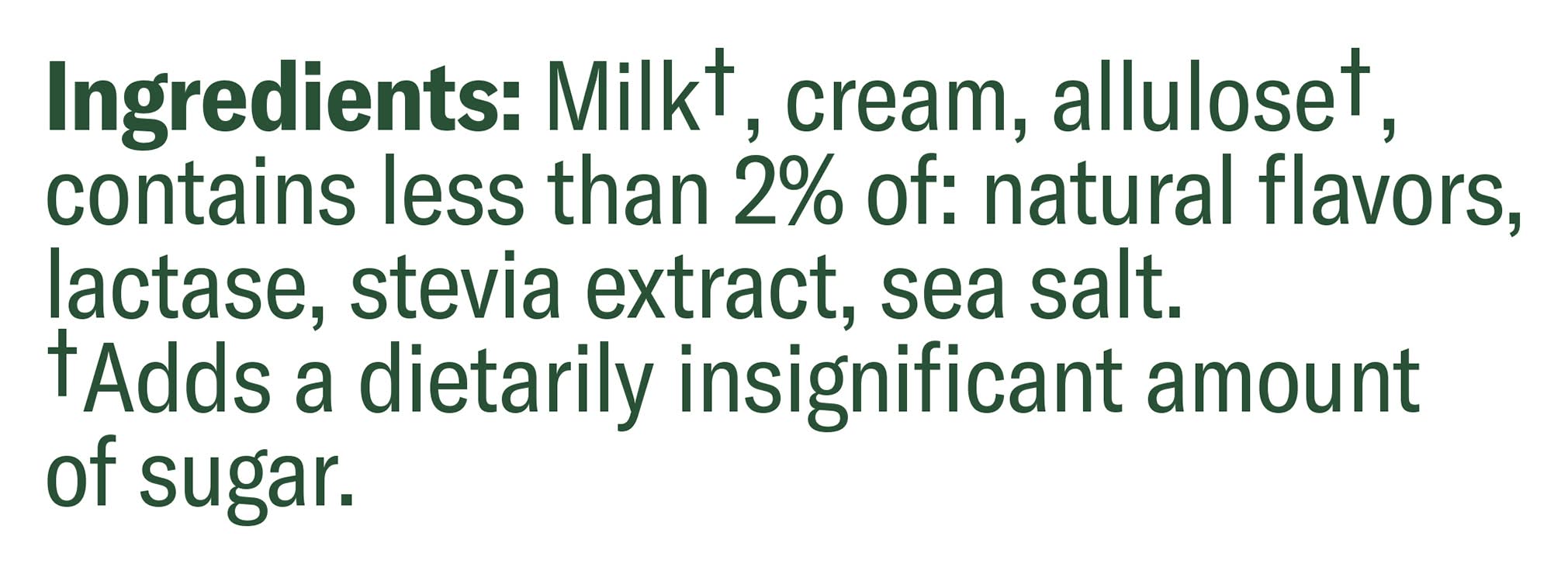 Ingredients: Milk (Adds a Dietarily Insignificant Amount of Sugar), Cream, Allulose (Adds a Dietarily Insignificant Amount of Sugar), Contains Less than 2% of Natural Flavors, Lactase, Stevia Extract, Sea Salt Contains: Milk