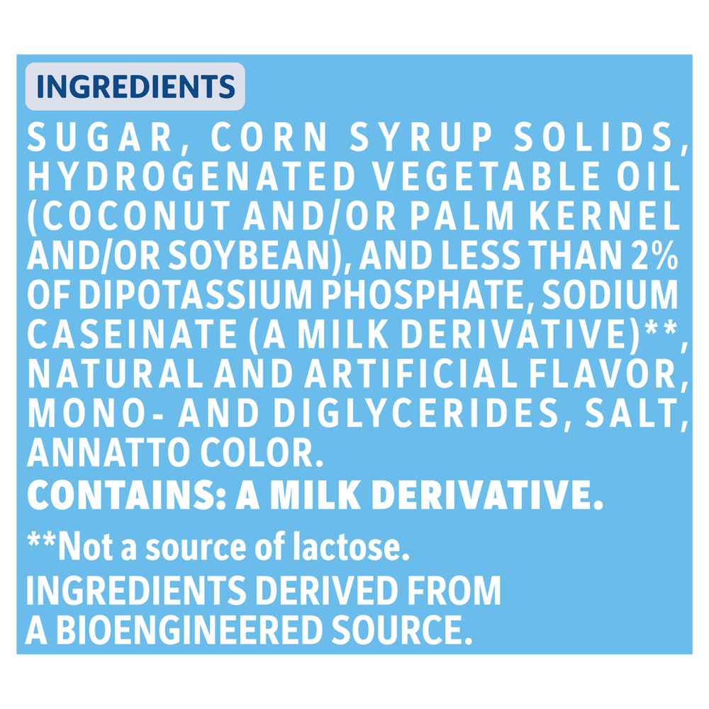 Ingredients: SUGAR, CORN SYRUP SOLIDS, HYDROGENATED VEGETABLE OIL (COCONUT AND/OR PALM KERNEL AND/OR SOYBEAN), AND LESS THAN 2% OF DIPOTASSIUM PHOSPHATE, SODIUM CASEINATE (A MILK DERIVATIVE), **, NATURAL AND ARTIFICIAL FLAVOR, MONO- AND DIGLYCERIDES, SALT, ANNATTO COLOR. **NOT A SOURCE OF LACTOSE. Contains: CONTAINS: A MILK DERIVATIVE.