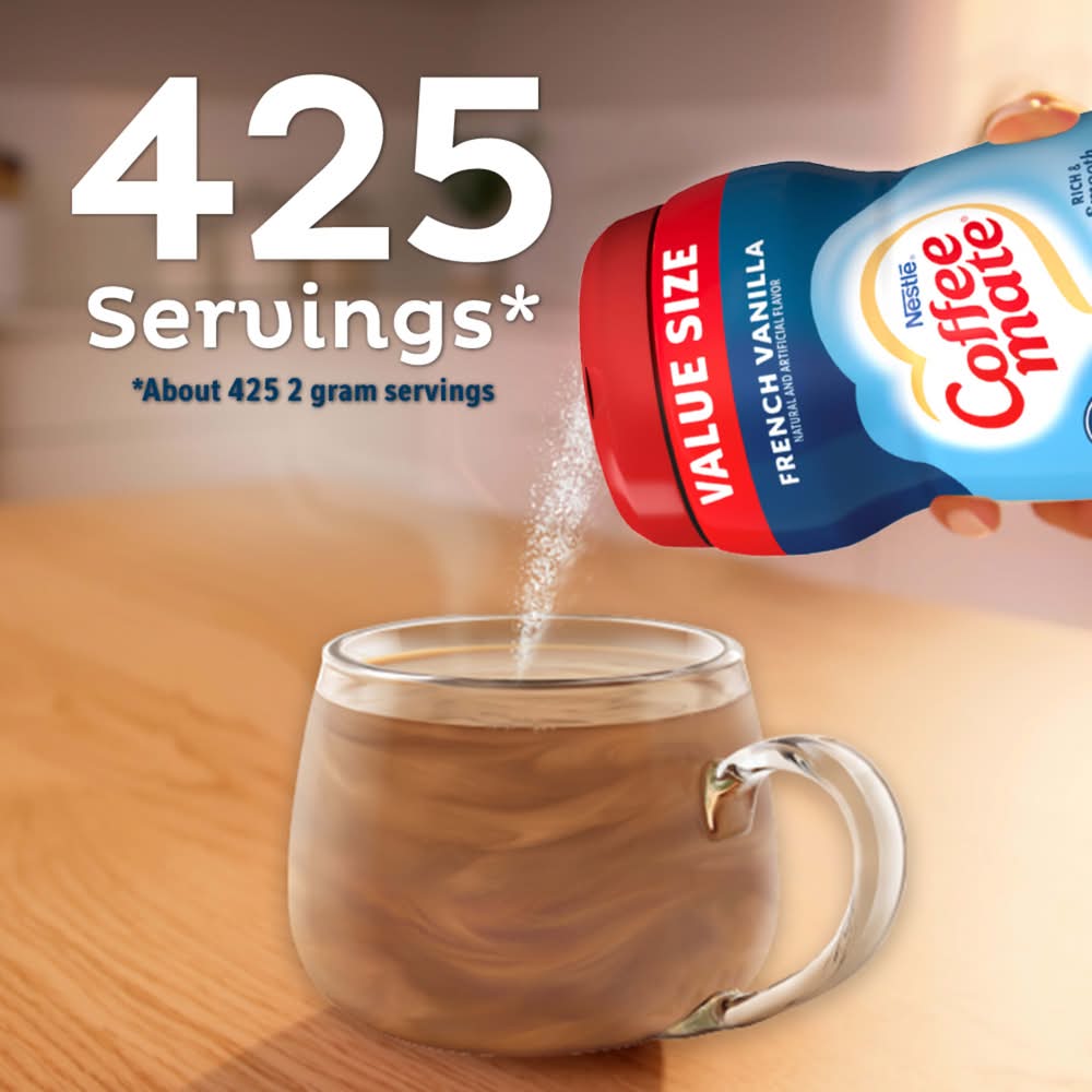 Nestle Coffee mate French Vanilla Powder Coffee Creamer is an ideal way to create a delicious cup of coffee perfection. Smooth and indulgent, this flavored French Vanilla creamer creates a rich, velvety flavor. This Coffee mate creamer is a lactose free, gluten free and non dairy creamer. This powdered creamer for coffee makes it easy to add the right amount of flavor every time, letting you easily transform your coffee into warm deliciousness. Whether it's your morning cup or afternoon pick-me-up, this powdered Coffee mate creamer makes it easy to wake up your coffee. Shelf stable flavored coffee creamer makes it easy to enjoy Coffee mate coffee creamer anytime. • Flavor: French vanilla • Packaging: Reusable