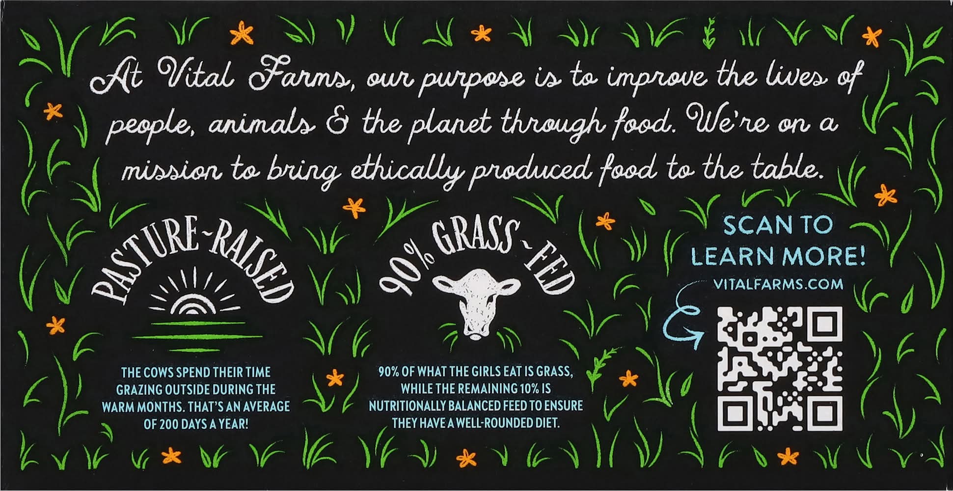 Our mission at Vital Farms is to bring ethically produced food to the table. The cows have freedom to graze on open pastures during the warmer months. In turn, they supply a rich cream that’s churned into creamy, golden butter. • Flavor: Salted • Vital Farms, Austin, TX, 78704 • Packaging: Reusable