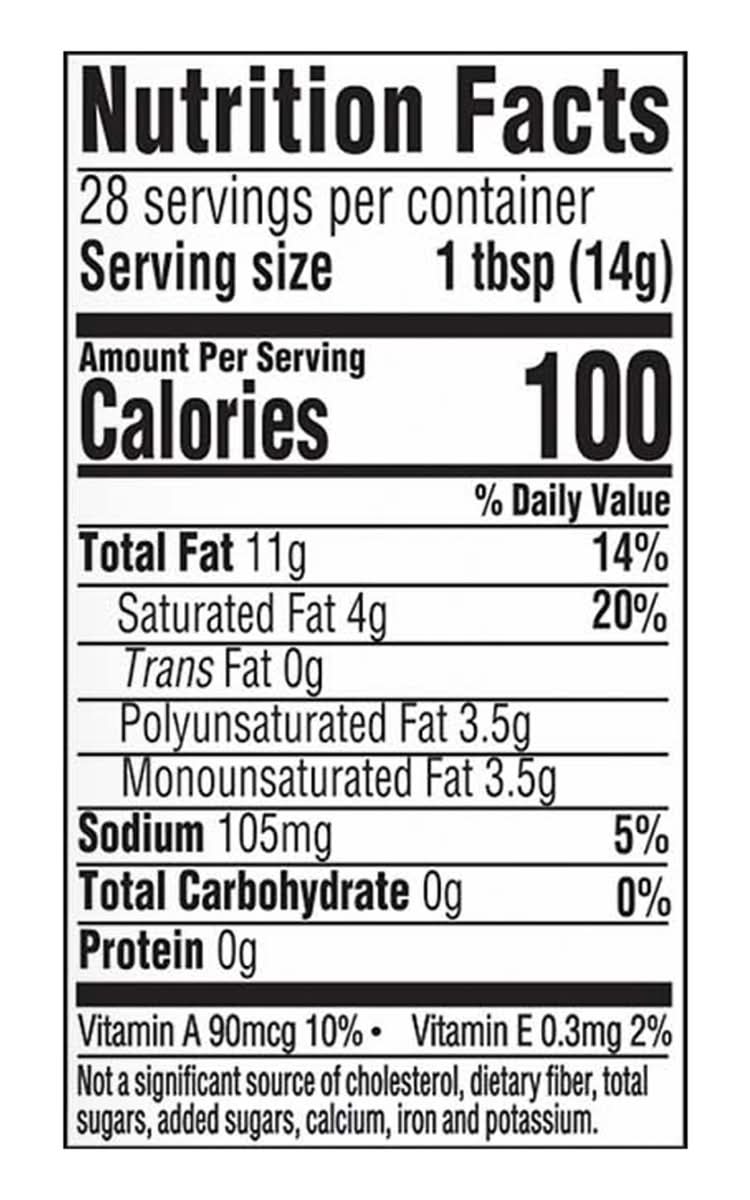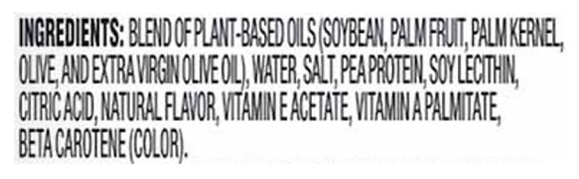 Ingredients: Blend of Plant-Based Oils (Soybean, Palm Fruit, Palm Kernel Olive, and Extra Virgin Olive Oil), Water, Salt, Pea Protein, Soy Lecithin, Citric Acid, Natural Flavor, Vitamin E Acetate, Vitamin A Palmitate, Beta Carotene (Color) Contains: Soybeans