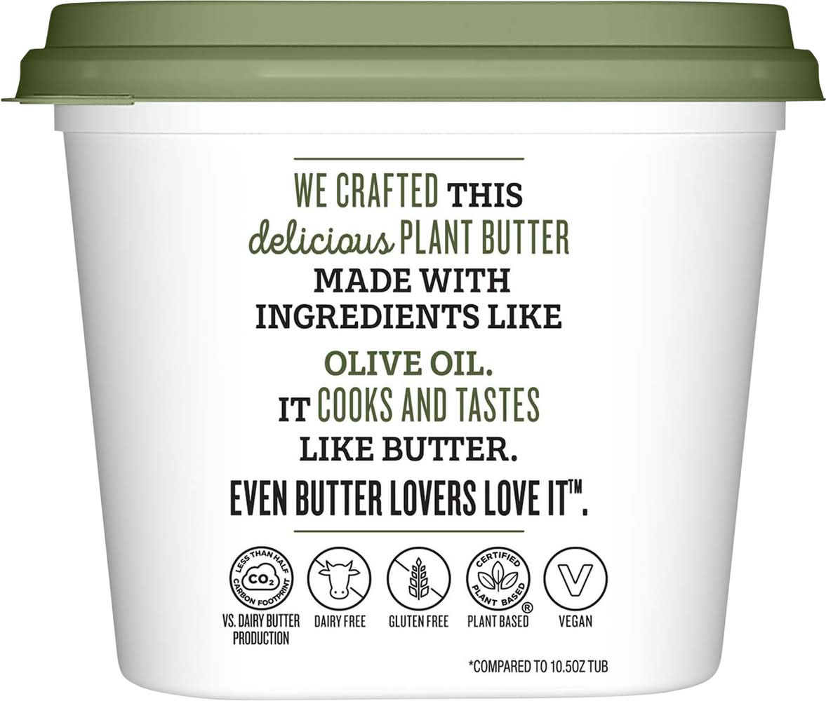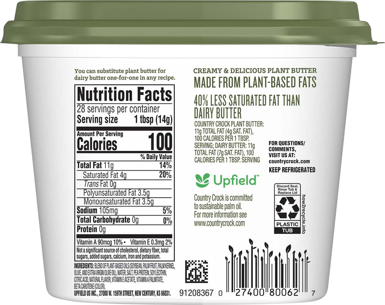 Country crock plant butter: 11g total fat (4g sat. Fat), 100 calories per 1 tbsp. Serving; dairy butter: 11g total fat (7g sat. Fat), 100 calories per 1 tbsp. Serving. Certified plant based. Vegan. Dairy free. Gluten free. Certified plant based. Vegan. Less than half Co2 carbon footprint. Vs. dairy butter production. Creamy & delicious plant butter made from plant-based fats. 40% less saturated fat than dairy butter. New. Larger size! (Compared to 10.5 oz tub) 79% plant-based oil spread. We crafted this delicious plant butter. Made with ingredients like olive oil. It cooks and tastes like butter. Even butter lovers love it. You can substitute plant butter for dairy butter one-for-one in any recipe. Great for all-purpose cooking, like sauteing or stir-frying! Packaging: Reusable