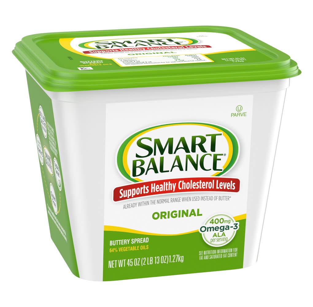 Smart Balance Original Buttery Spread is a butter alternative that offers all the deliciousness of butter without the dairy. This margarine spread substitute supports healthy cholesterol levels* when used as part of a healthy diet that is low in saturated fat and that includes exercise and other physical activity. This vegetable oil spread has 400 milligrams of omega-3 ALA and 20% of your daily value for vitamin D per serving. It's a non dairy butter substitute that is gluten free and made with no hydrogenated or partially hydrogenated oils, and it contains 60% less saturated fat than butter per serving. This spreadable butter alternative is easy to use on all of your favorite foods. Use this butter spread substitute in anything you cook or bake. It's delicious on toast, hot muffins, vegetables and more. Smart Balance buttery spread comes in a convenient 45 ounce butter tub to keep you stocked longer. Love the feeling you get from truly great food. Smart Balance makes the staples of your diet better than beforefor you, your family, and the world.*Already within the normal range. Conagra Brands, P.O. BOX 3534,, Chicago, IL, 60654