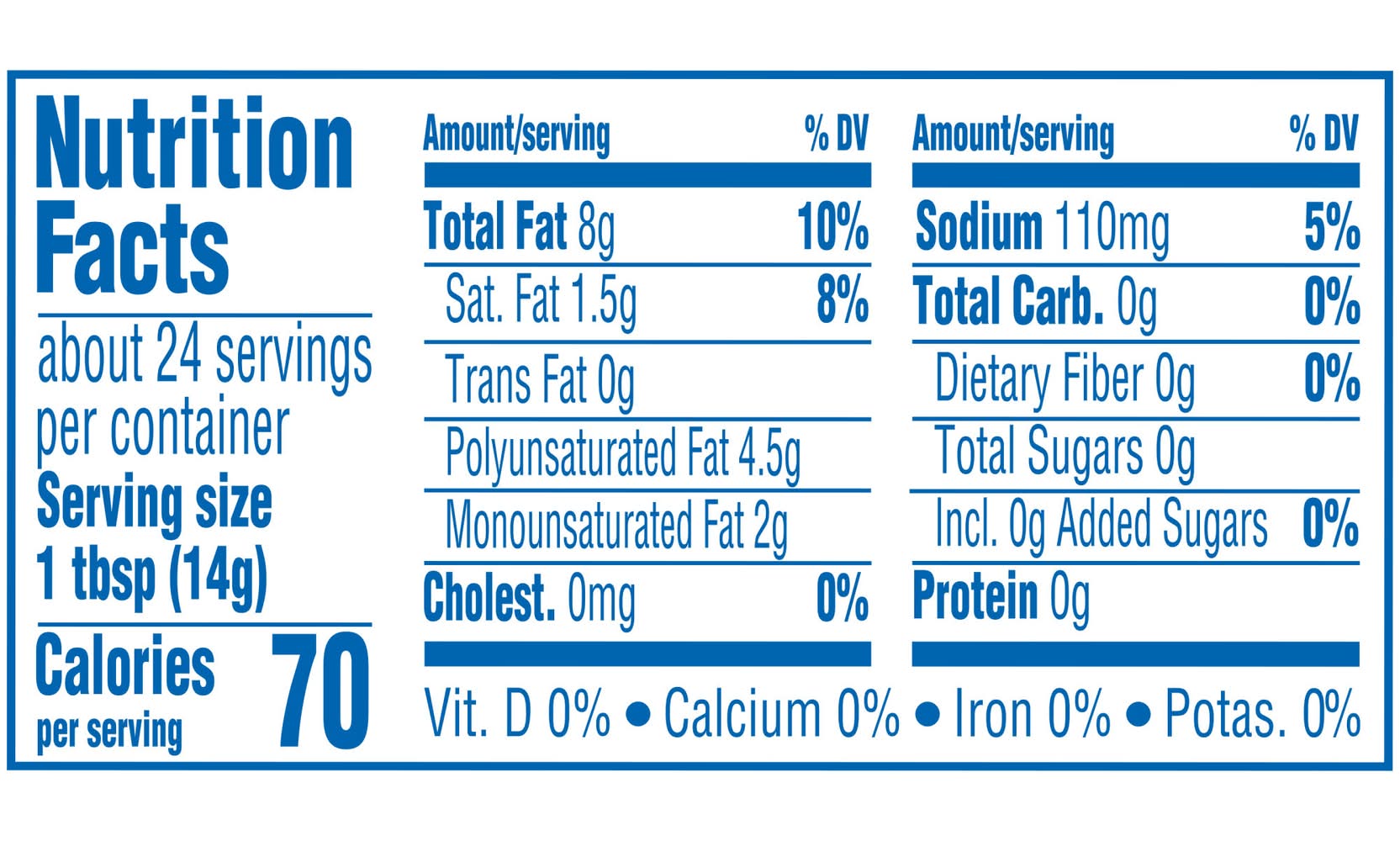 Ingredients: Soybean Oil, Water, Contains less than 2% of: Salt, Hydrogenated Cottonseed Oil, Monoglycerides and Soy Lecithin (Emulsifiers), Natural and Artificial Flavor, Potassium Sorbate and Sodium Benzoate (To preserve freshness), Phosphoric Acid, Vitamin A Palmitate, Beta Carotene (Color), . CONTAINS: SOY Contains: Soy